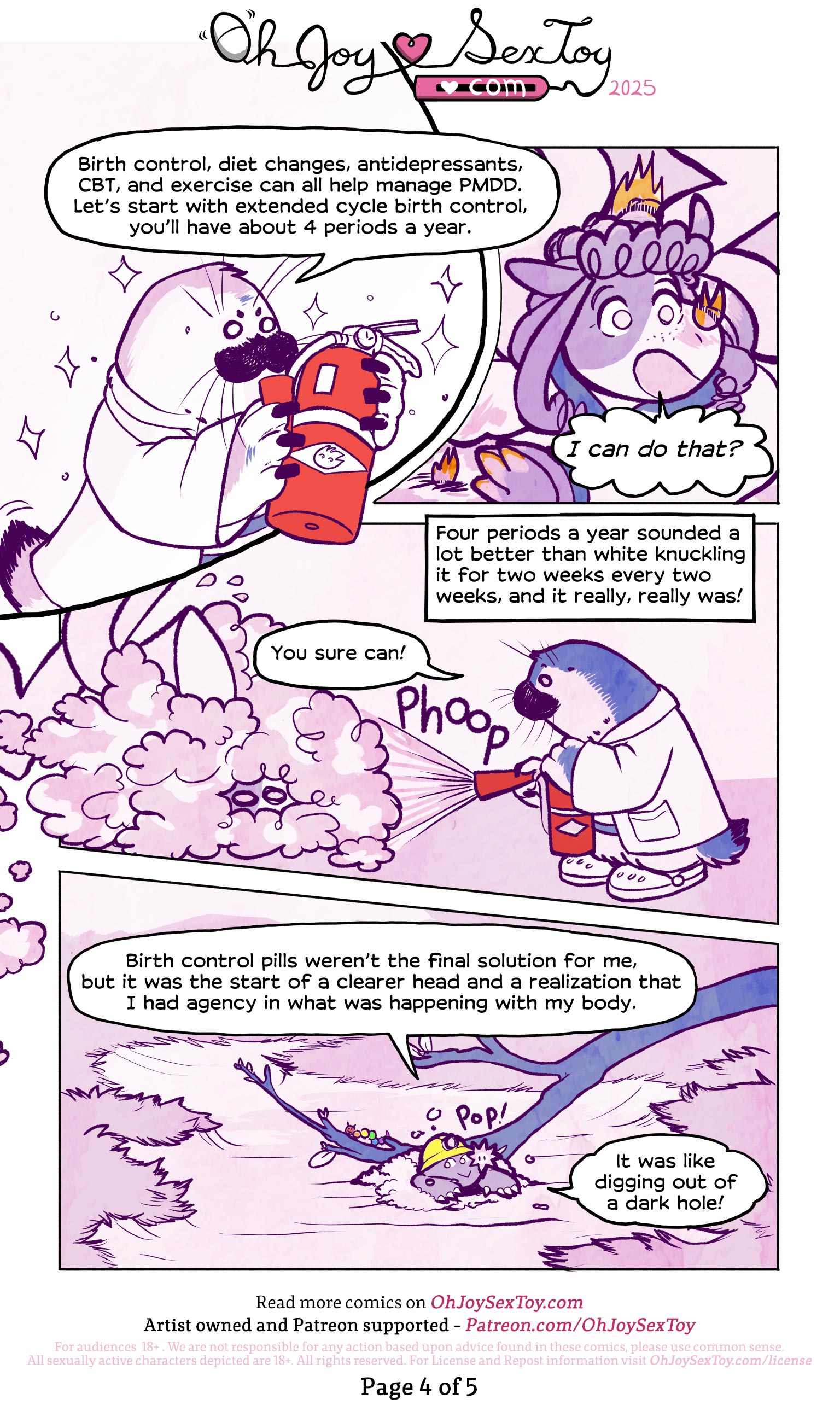 Jey points to a panel from page 4, the scene where they left the pills at home, and says “After that first month, nothing! But, if I miss it by a day, I’ll get crampy and maybe have some spotting.”