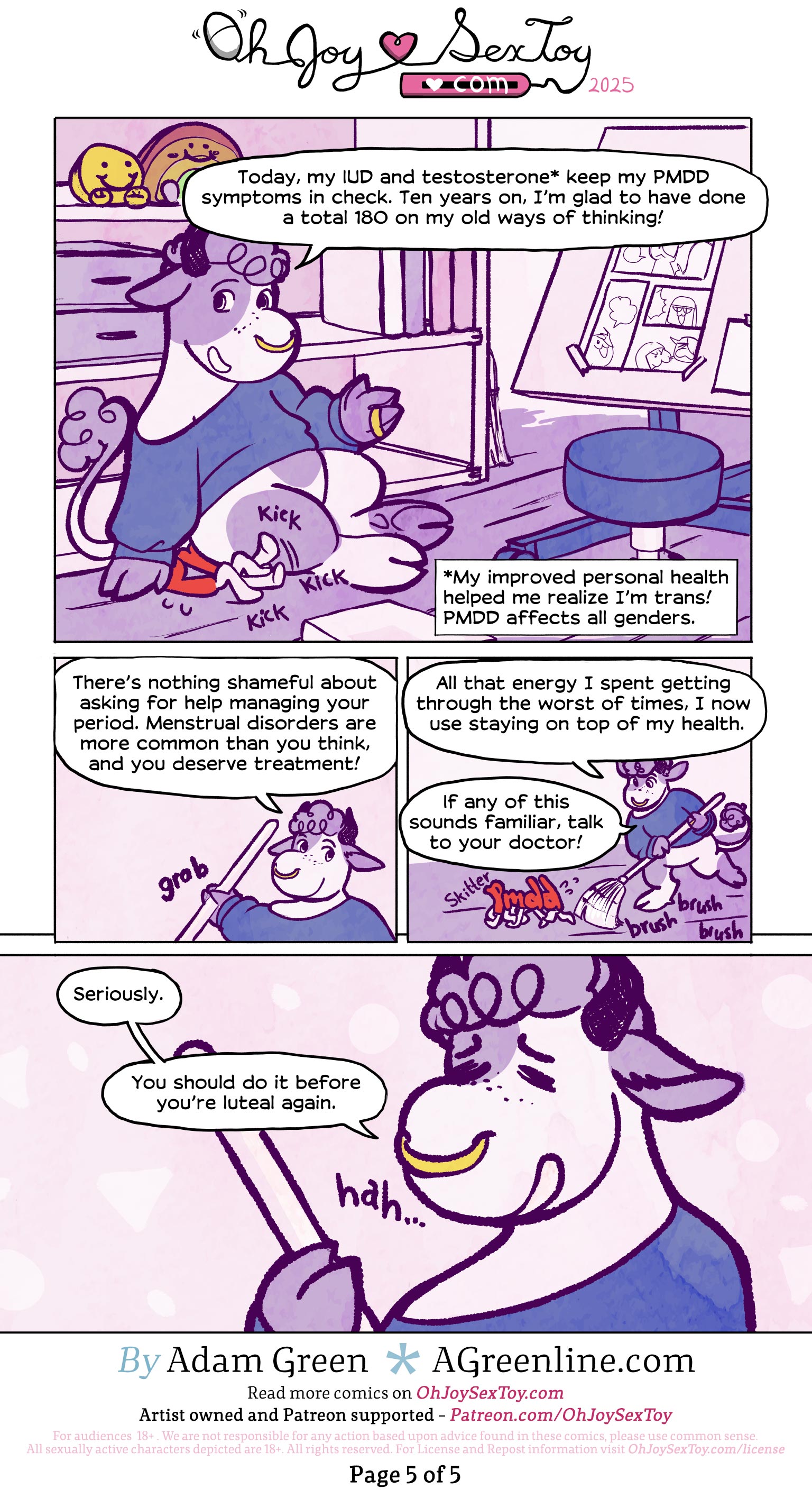 I’ve been excited to share this comic because I’m just so happy that I’ve nixed my period finally! Sometimes a low dose of T just isn’t enough to get rid of your period, but luckily there are options. I’m so grateful to my endo for helping me out and being super supportive.