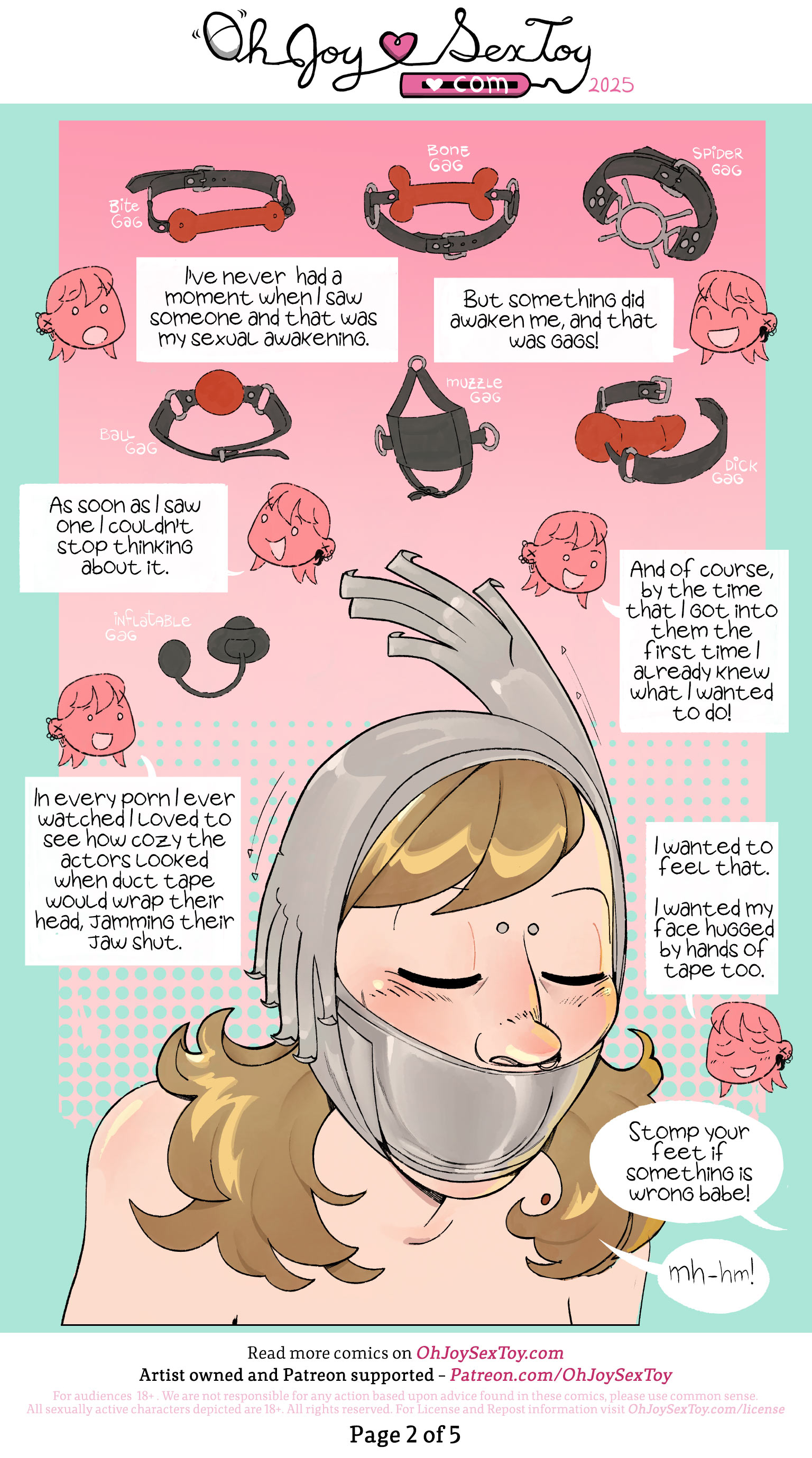 An assortment of different gags is displayed across the top of the page while Eli's chibi-fied face explains, "I've never had a moment when I saw someone and that was my sexual awakening. But something did awaken me, and that was GAGS! As soon as I saw one I couldn't stop thinking about it."
