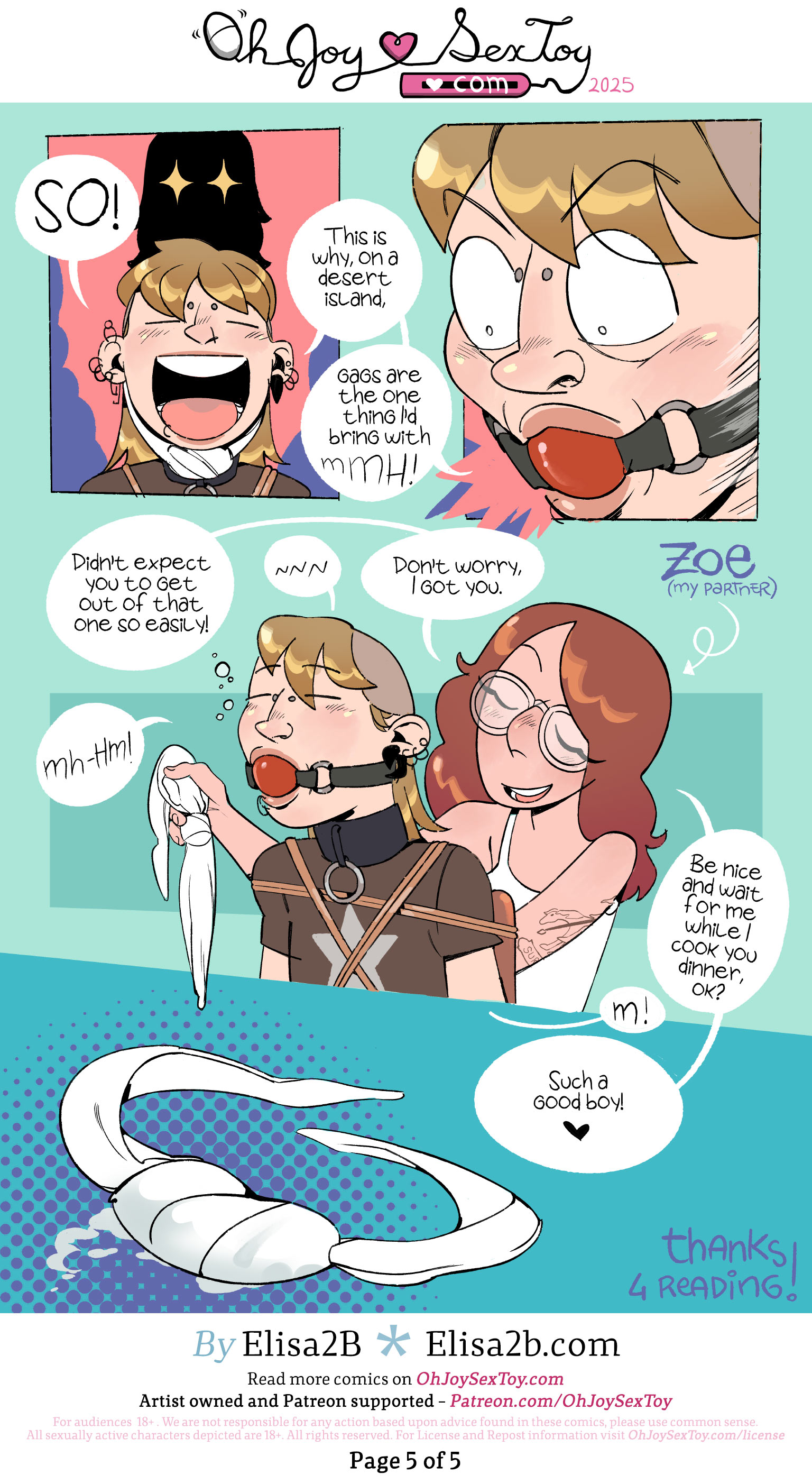 Returning to the opening scene of the comic, we rejoin Eli with their white gag pulled just below their chin.