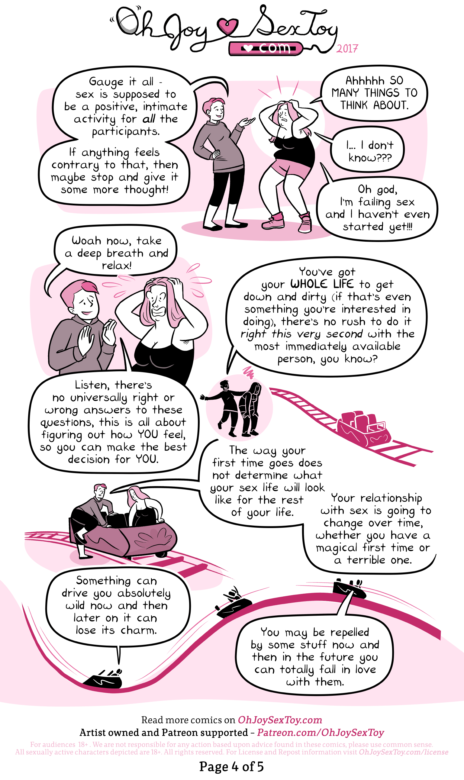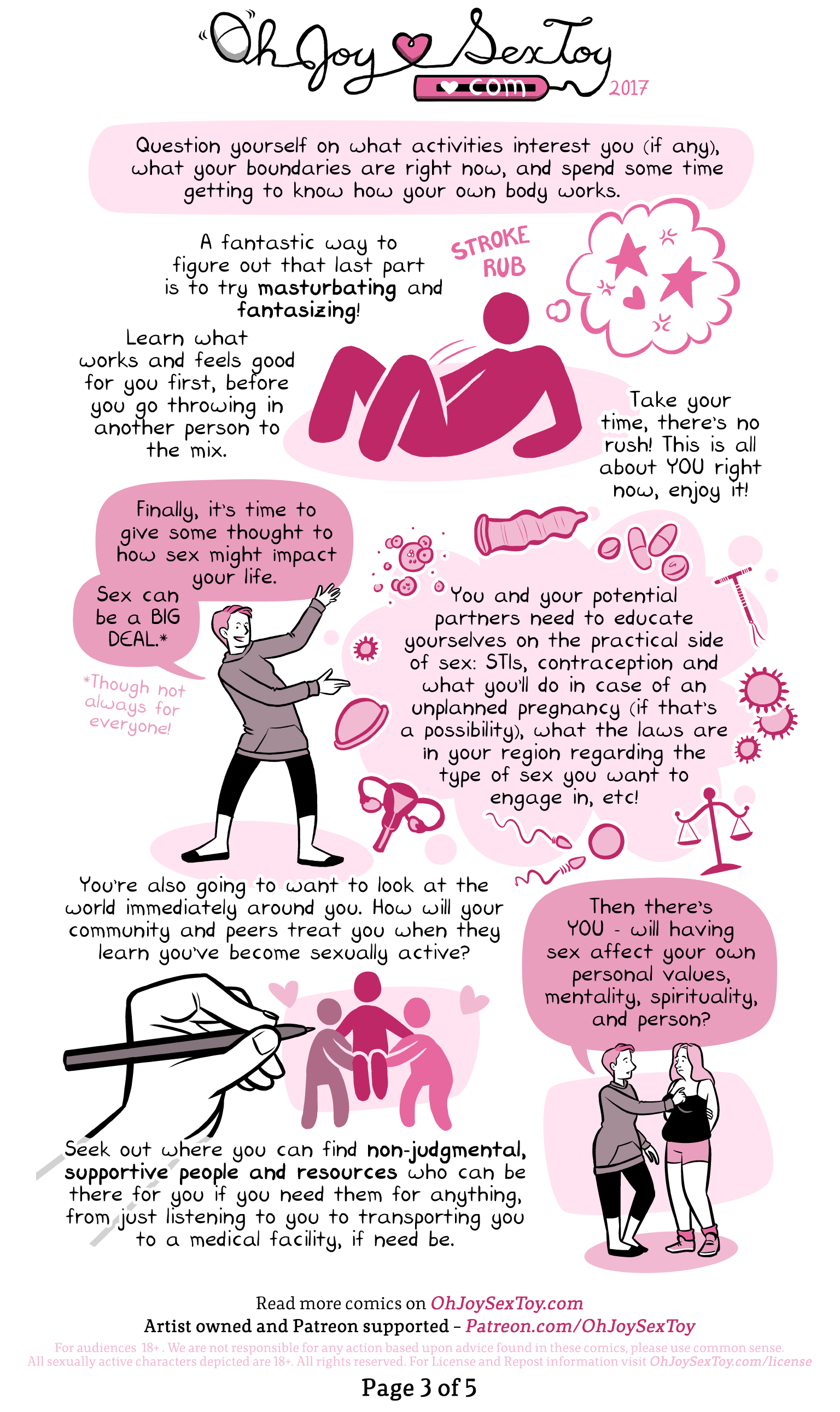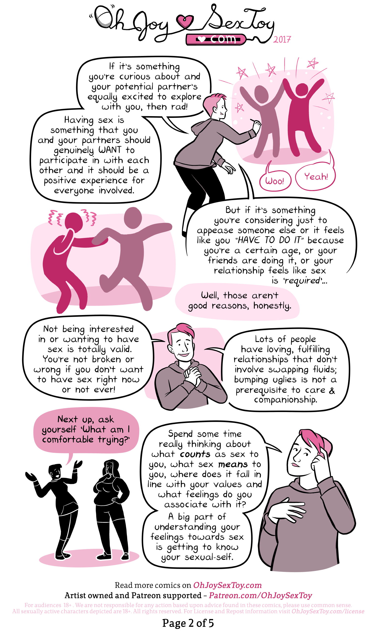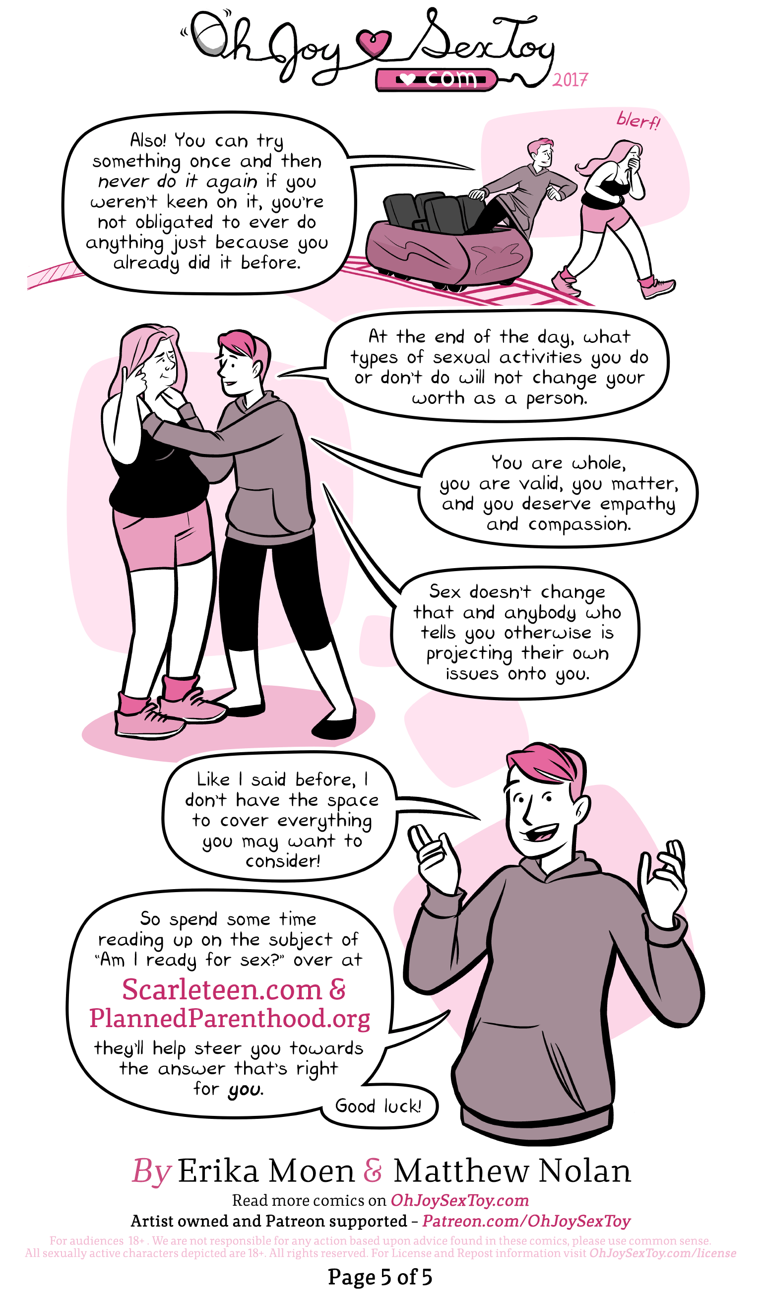Haha, oh jeez, I’ve been avoiding this comic since we launched four years ago. “How do I know if I’m ready for sex?” (and variations of that question) is one of our most frequently requested topics and it’s… it’s a hard one! Hence my avoidance. BUT. No more dodging it. Here’s our INTRODUCTORY stab at this subject. Matt and I tried our best, but there’s no way we could possibly cover every single thing you’ll want to consider, which is why we REALLY recommend you read up some more at the links below and keep asking yourself questions, see where it takes you. Sex is a personal world of continued self-discovery, you’re always going to be learning and evolving over time. And, SUPER IMPORTANT: SEX IS SO MUCH MORE THAN A PENIS GOING IN A VAGINA. Phew, ok, now you should go read the rest of these links…