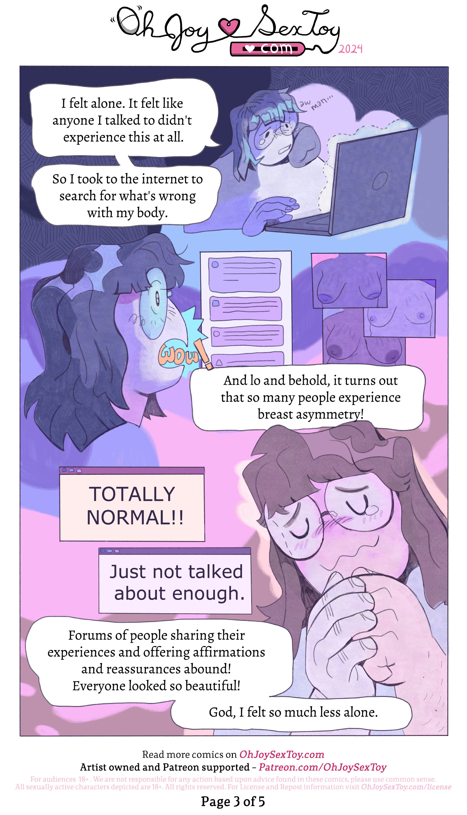 "But because my breasts are two different sizes, I could never get a comfortable fit, and they would shift really quickly." Reads the narration under the previous panel.
