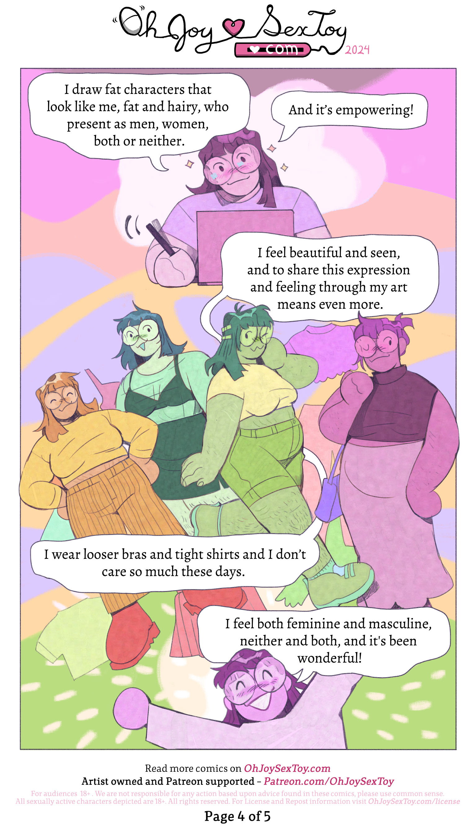 "I draw fat characters look like me, fat and hairy, who present as men, women both or neither." Robogert tells us while drawing away at their laptop. They are hued in pinky-purples and their hair falls just past her shoulders. "And it's empowering!"