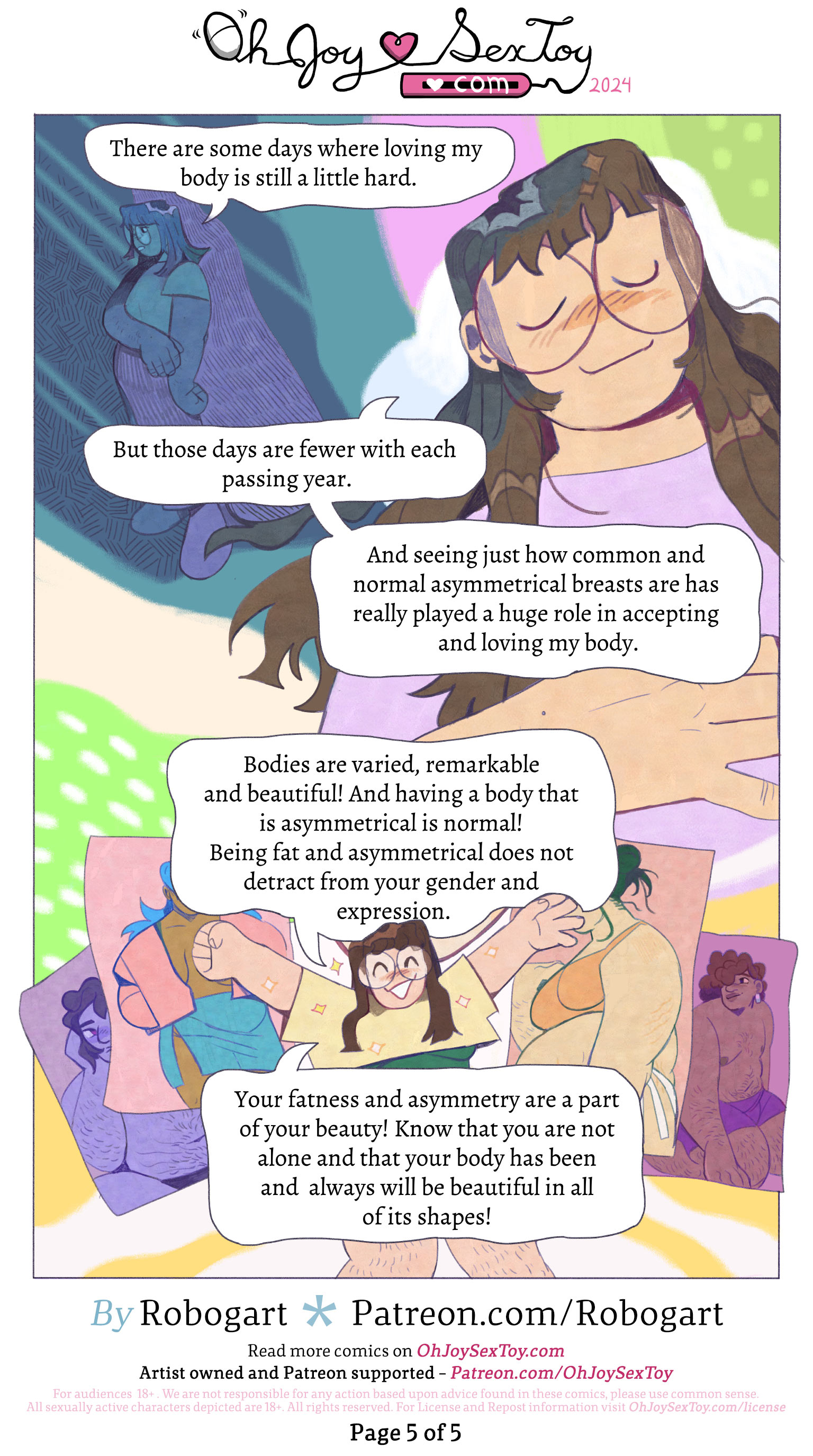 The top half of the page is toned in all purple hues. Robogart stands before us nude, with her hands clasped over their heart. A large phantom circle floats over where her right breast would be, labeled D. Over the left breast is a smaller phantom circle labeled C. Behind her are two giant figures with uneven breasts and stretch marks leading to them. "I've always had asymmetrical breasts." Robogart shares demurely, eyes closed and standing between the giant background figures. "But as I've gained more weight over time, they became more noticeable. Almost a whole cup size of difference at this point. I've already felt so strange in my body. Too fat to be queer."