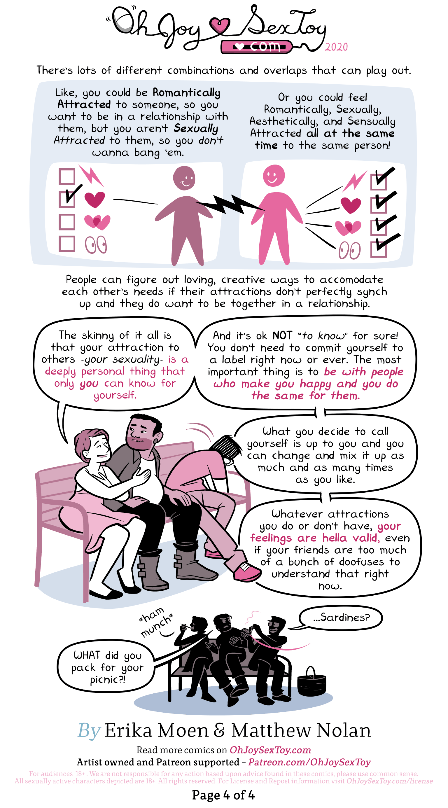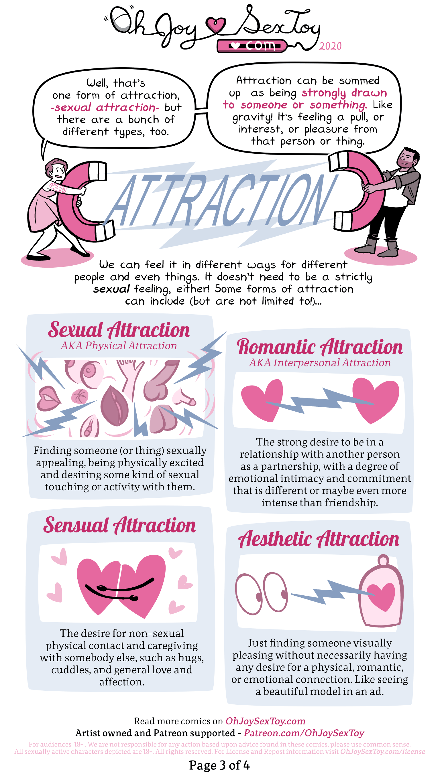 As always, this comic is the briefest of introductions to the concept of what attraction can be, the different ways it can manifest, and how one can label it— and there are many different points of view out there! There’s so much more to learn about attraction, sexual orientation, identity labels, relationship models, and, you know. Like. Everything.