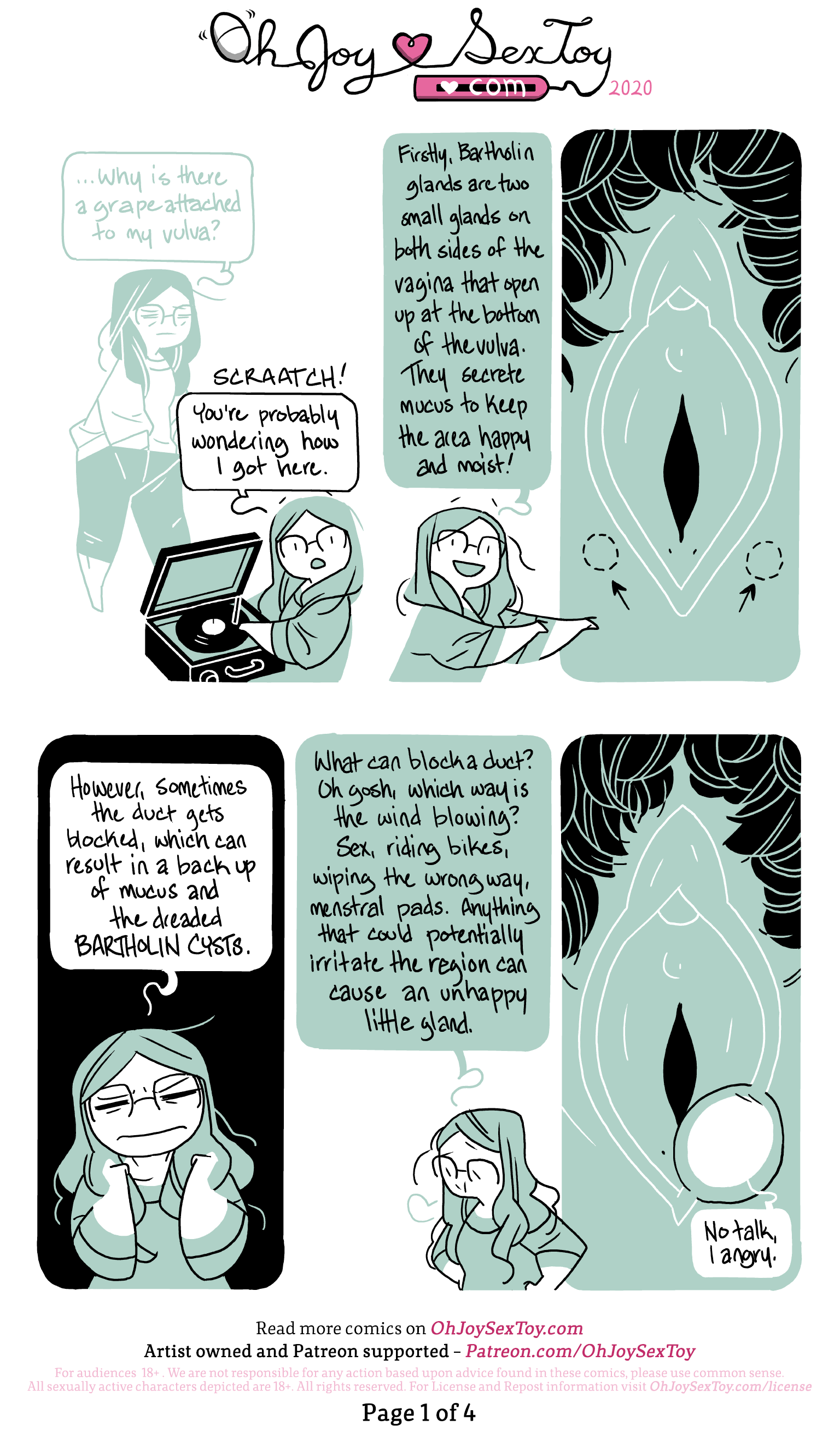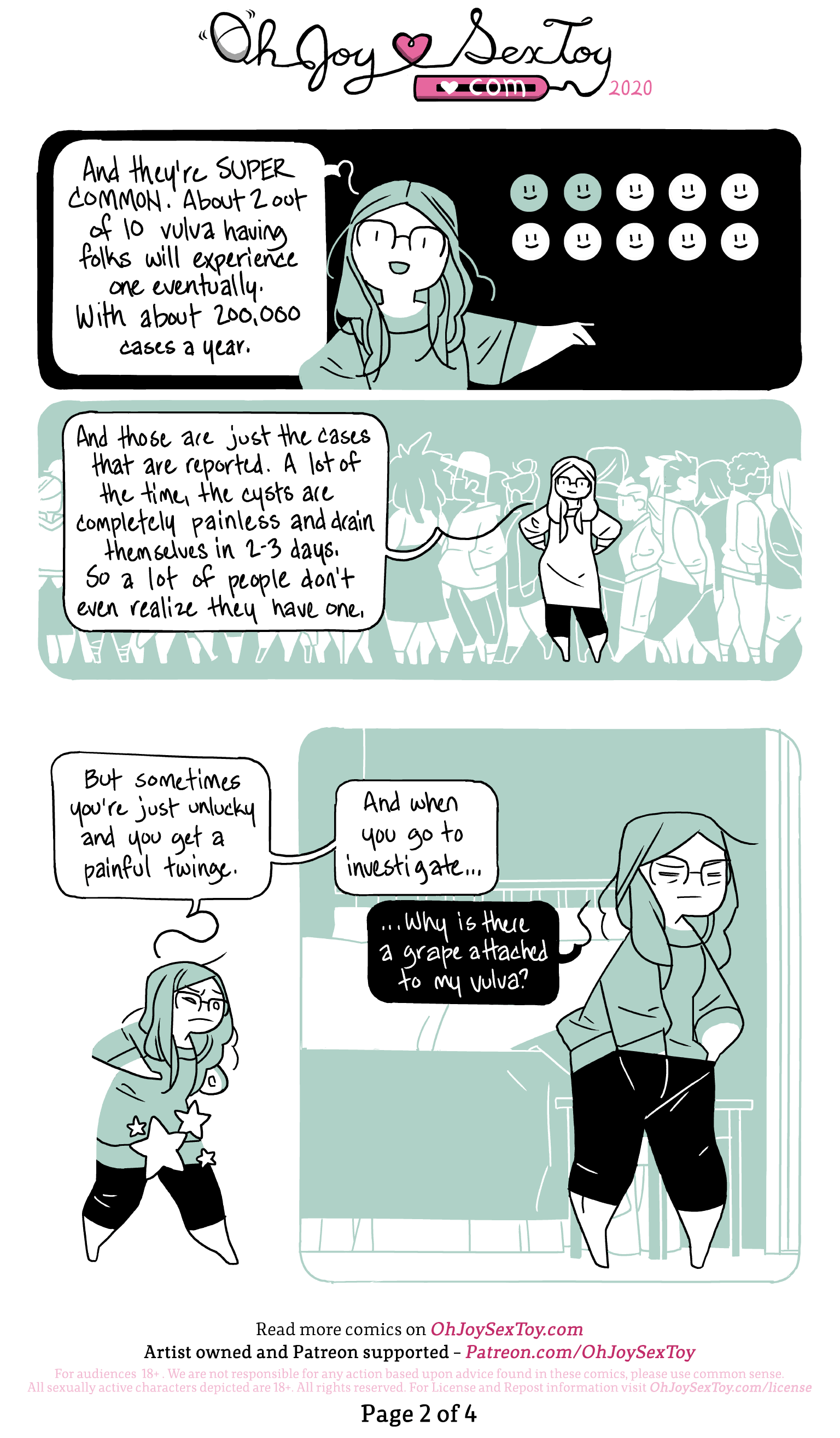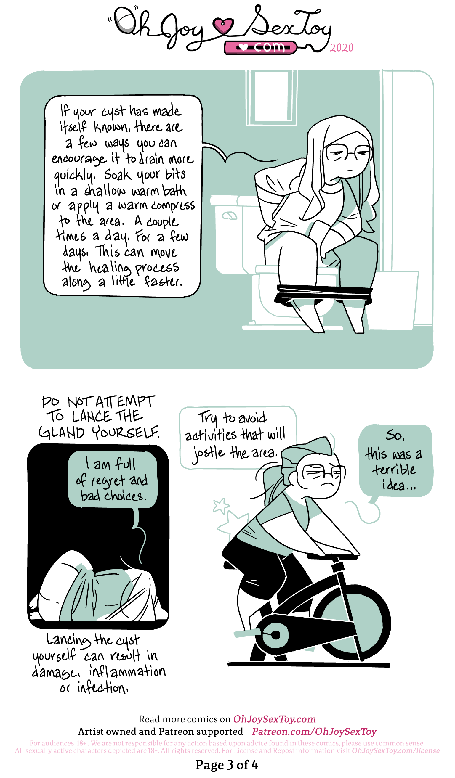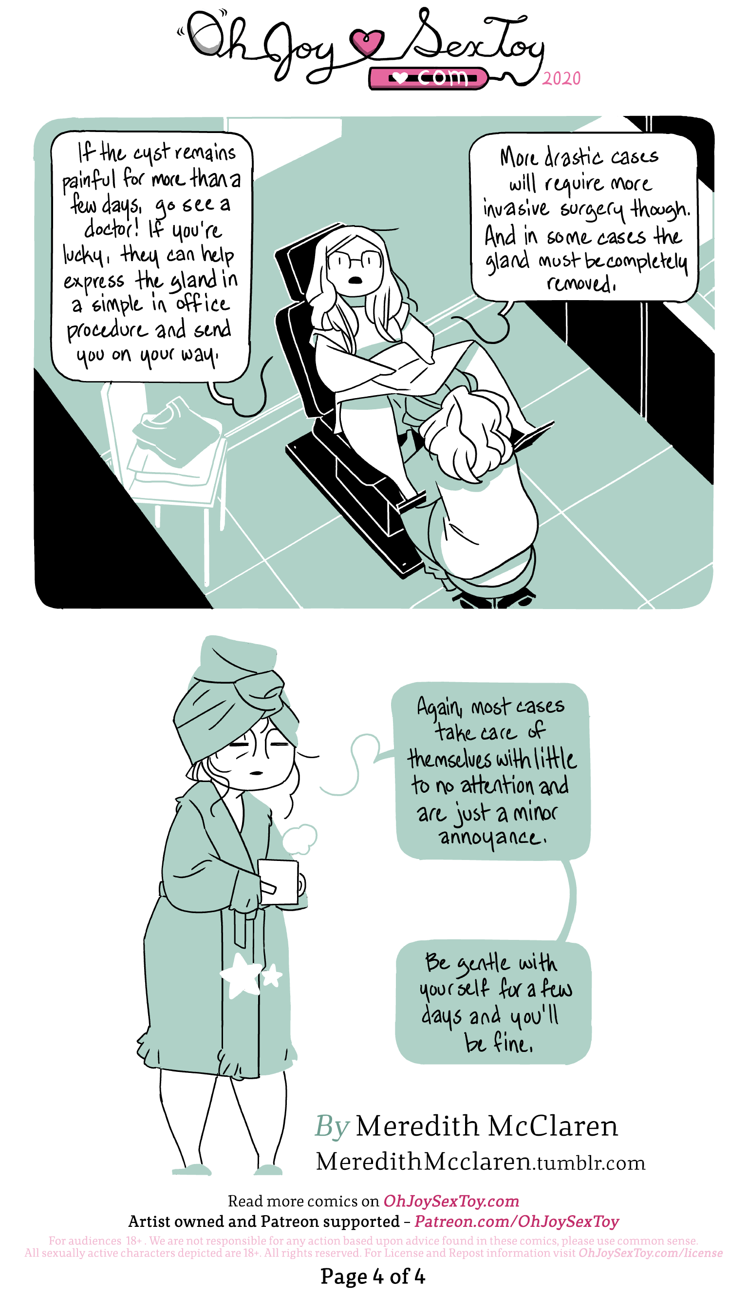 But first, before we talk about gross cysts. Here are some links to Meredith’s work! She’s previously made us some comics on the Folson Street Fair AND visited a Fetish Ball. Both made in a different era when we could all leave our houses and socialize :,( Regardless – Meredith is awesome-sauce and you’ll love her work, ESPECIALLY the Super Fun Sexy Times comic (if you’re looking for something to read while you isolate!)