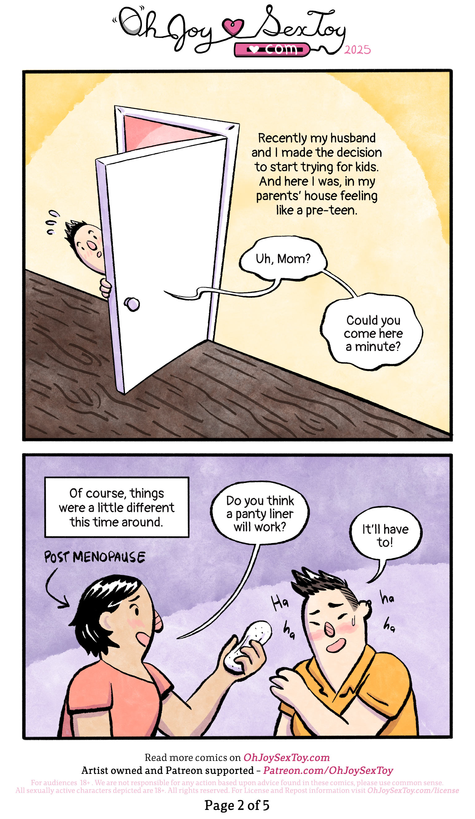 "Do you think a panty liner will work?" Christine's mom asks while offering one in her hand. She is a Mexican woman with chin length black hair. The caption "Post Menopause" helpfully points at her with a little arrow.