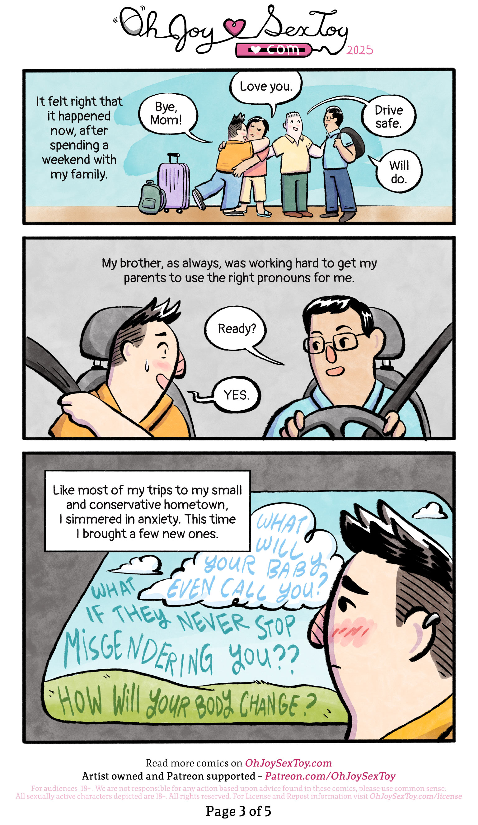 Christine looks contemplatively out the car window as the sky and hillside roll by. The scene outside the window fills up with their internal worries, reading, "What will your baby even call you? What if they never stop misgendering you?? How will your body change?"
