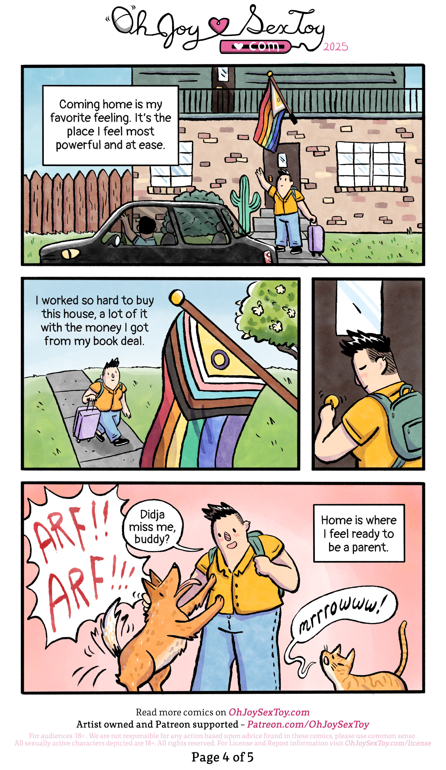 Christine stands on the walkway leading to their home, waving to their brother's car as he drives away. Their brick house has a brown picket fence, green lawn, and both a cactus and a shrubby bush just to the side of the entrance steps. A big Progress Pride flag hangs proudly over the front door, showing both the traditional rainbow stripes with the newer addition of the back, brown, blue, pink, and white chevrons with a purple O on a yellow triangle.