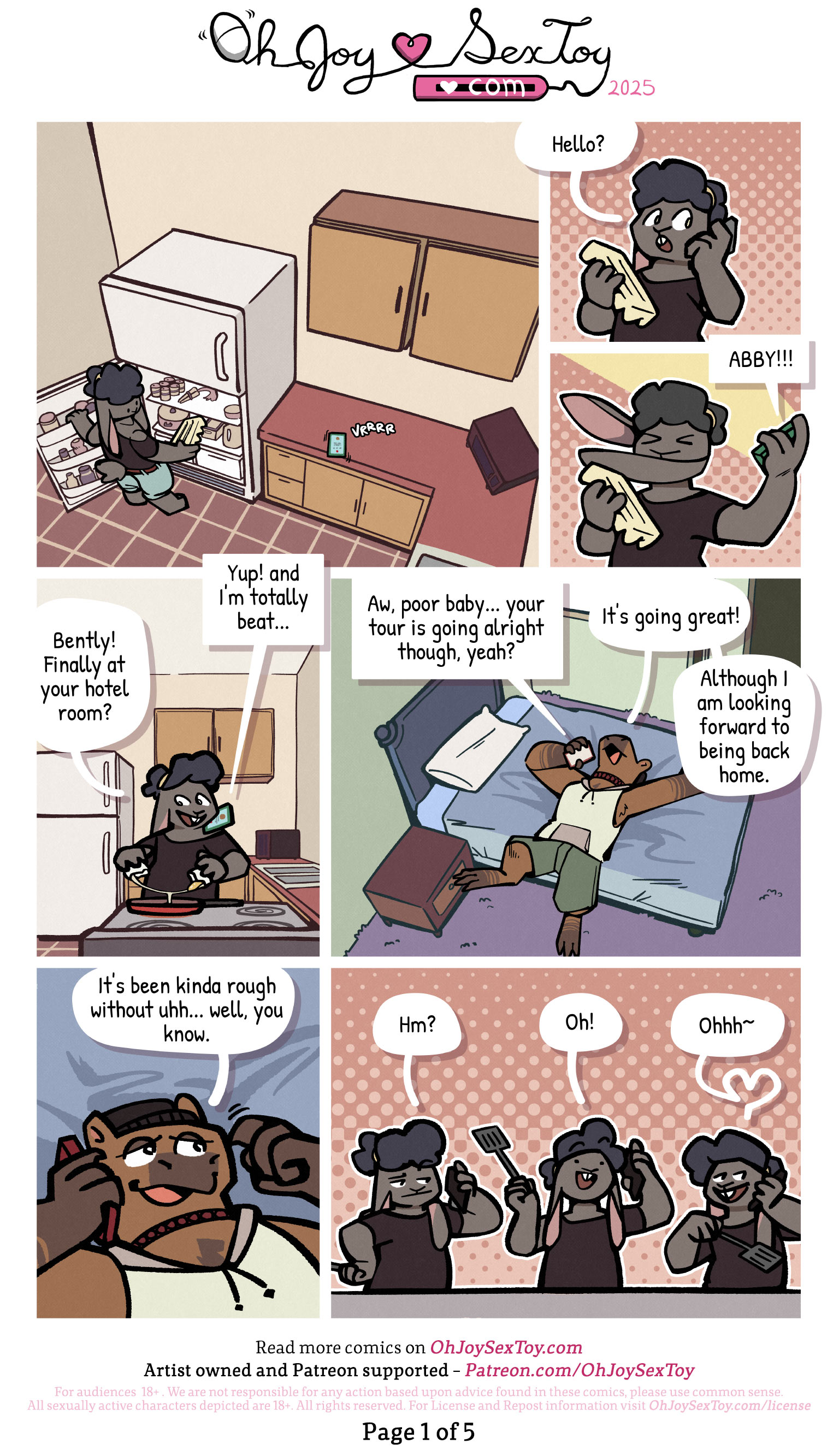 Abby is an anthropomorphic rabbit with a short build, long droopy ears, and dark curly har. Their chest is small and they have thick legs. The comic opens with a high up shot, looking down at an angle on Abby mid-rummage in their refrigerator with an egg carton in their hand before looking over at their cellphone vibrating on their kitchen counter.