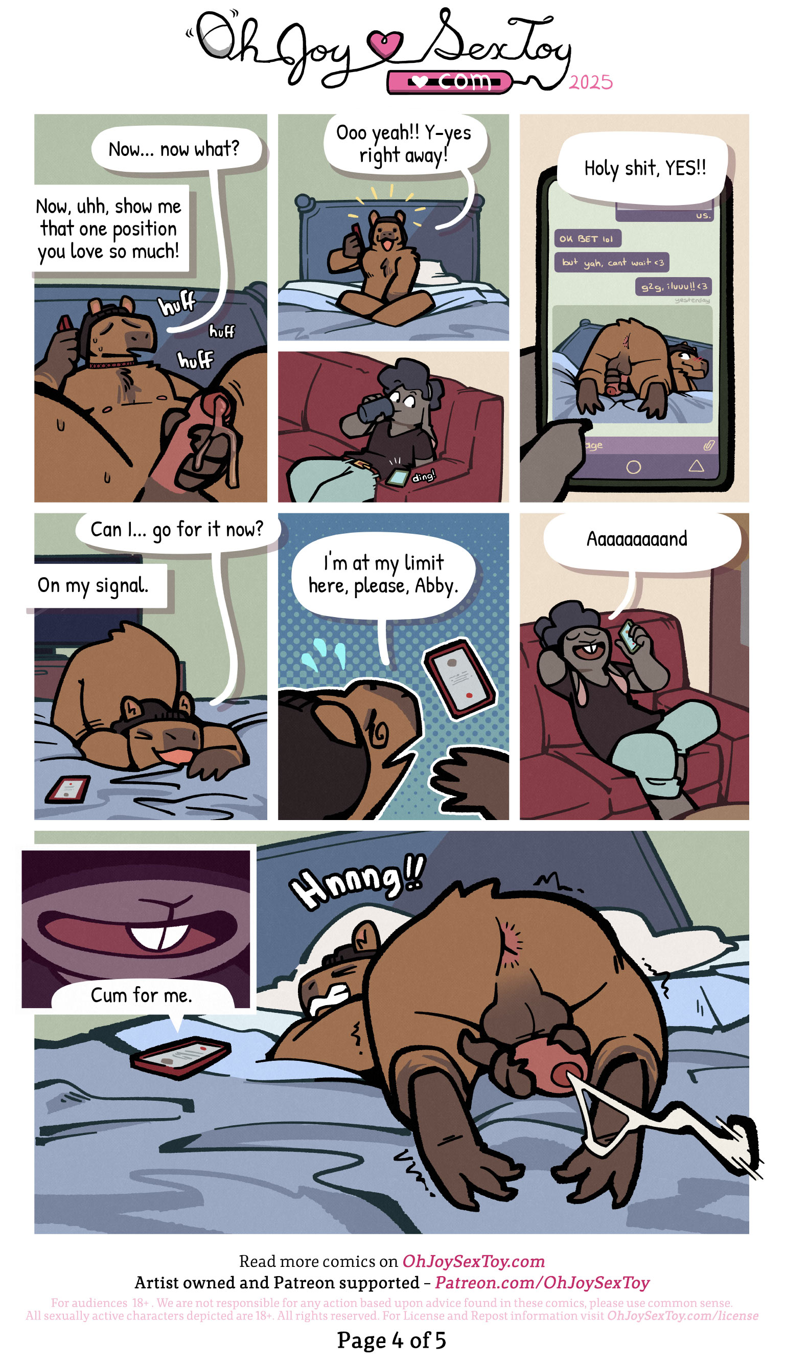 With an ominous close-up on their mouth, Abby concludes, "Cum for me."
