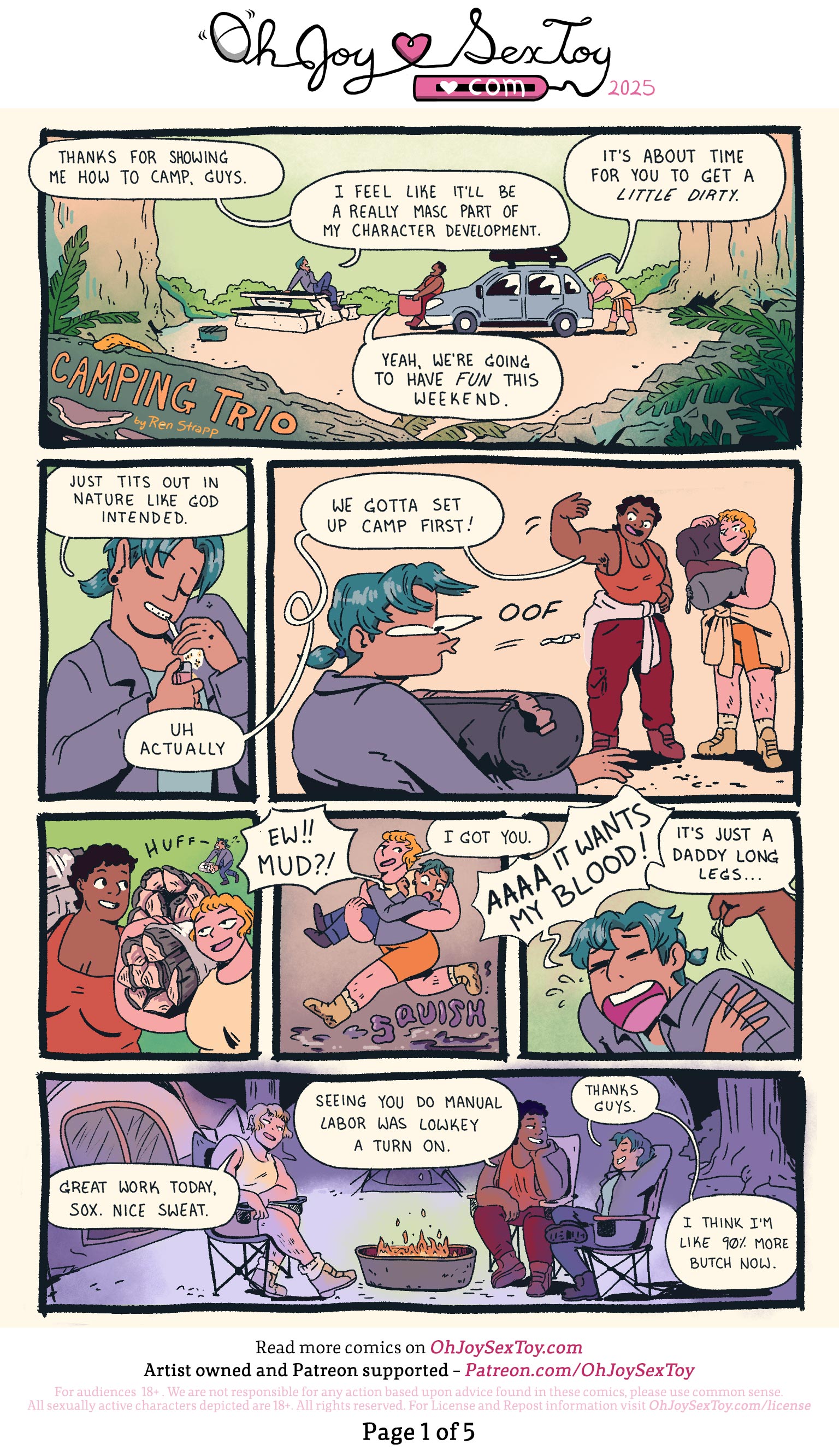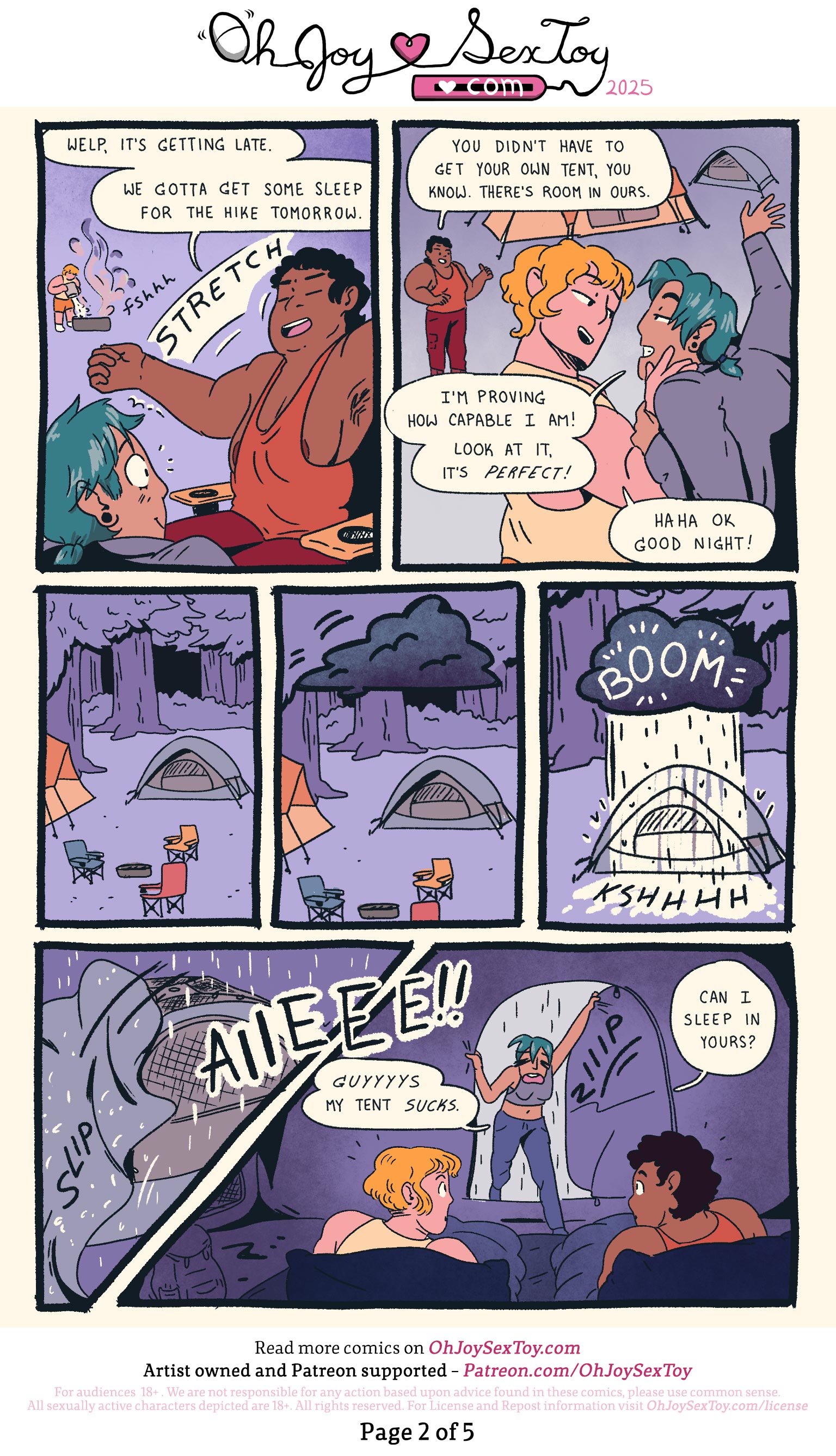 Ren Strapp is here to help you pitch your tent! Just in time too, as the forecast is saying things are about to get wet. A lovely, fun and sexy comic this week! Perfect timing as the seasonal weather here in the PNW turns and all of us get excited to go out doors again.