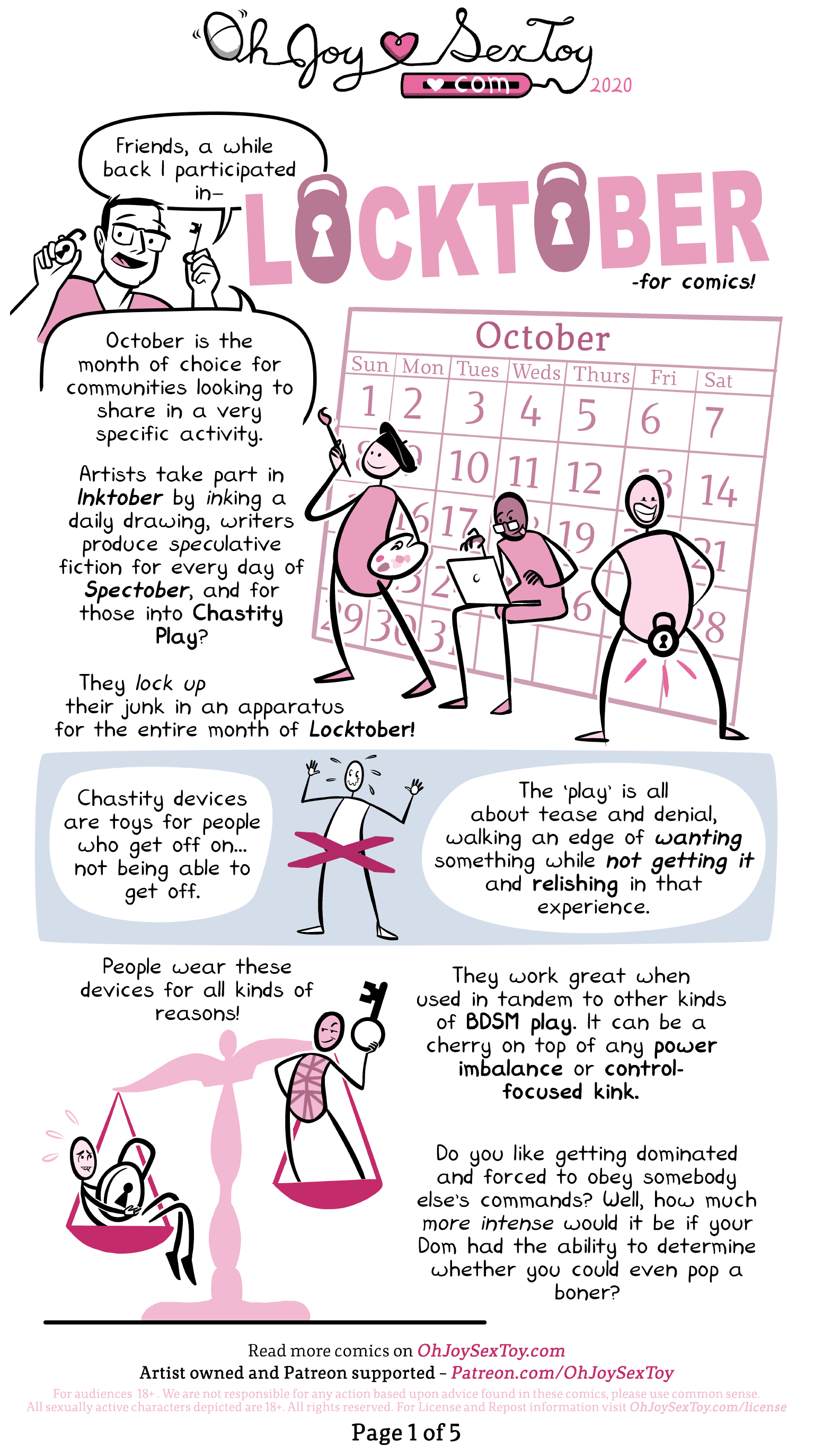 The narration explains, "Artists take part in Inktober by INKing a daily drawing, writers produce SPECulative fiction for every day of Spectober, and for those into Chastity Play? They LOCK UP their junk in an apparatus for the entire month of Loctober!"