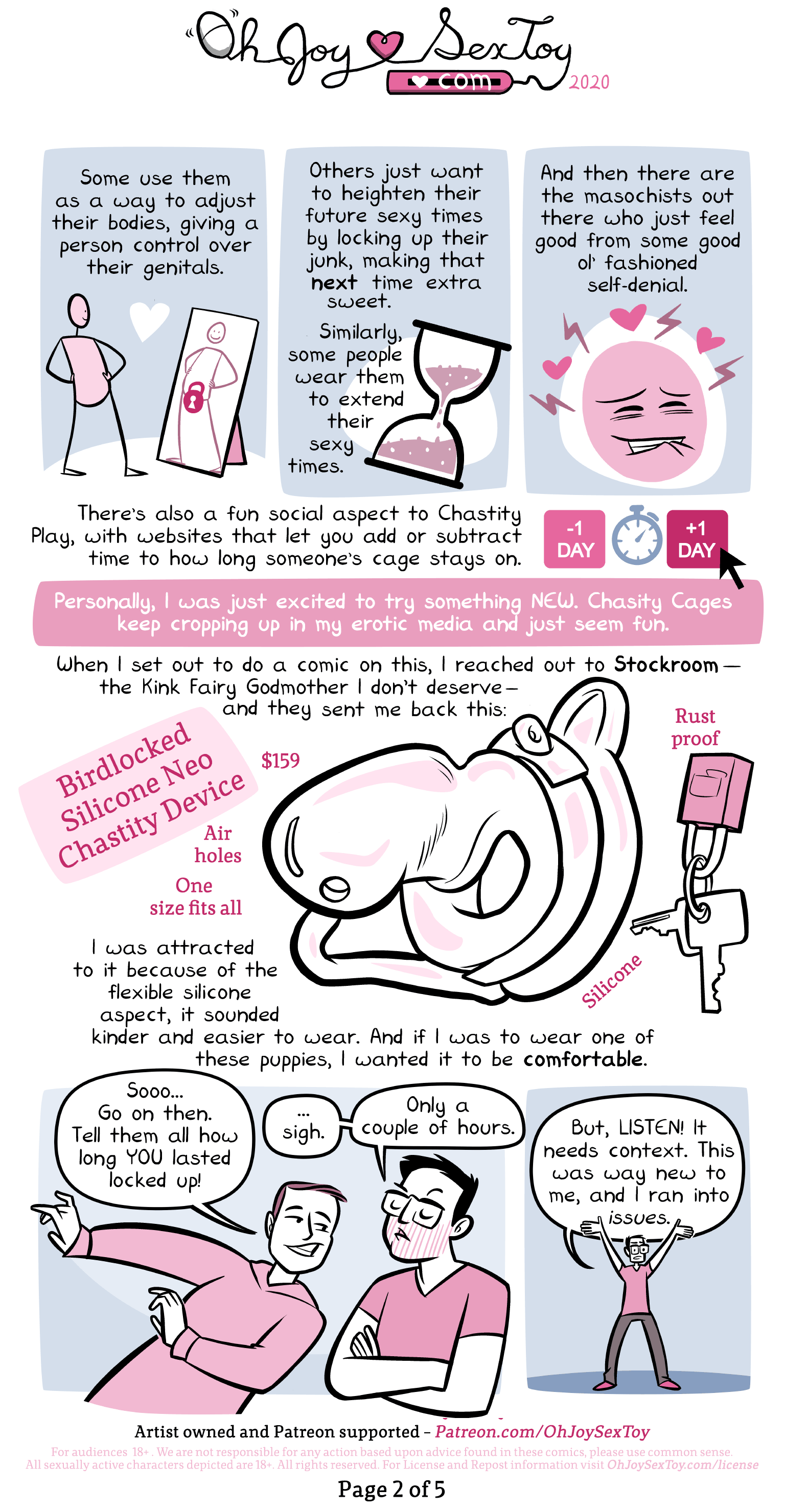 Narration: Personally, I was just excited to try something NEW. Chastity Cages keep cropping up in my erotic media and just seem fun. When I set out to do a comic on this, I reached out to Stockroom- The Kink Fairy Godmother I don't deserve- and they sent e back this: