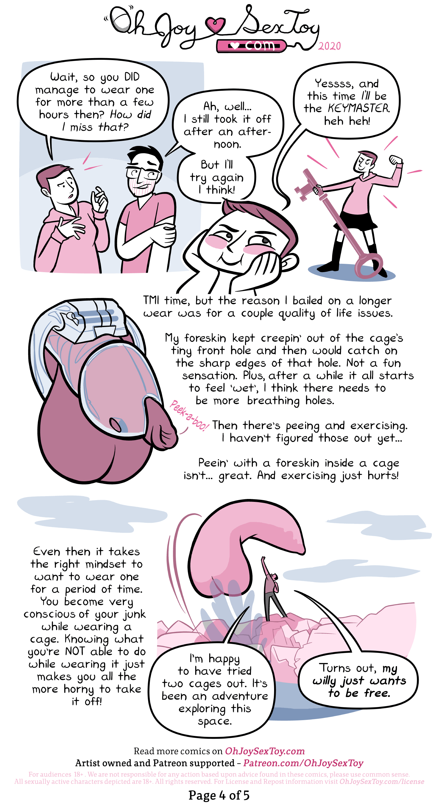 Narration: My foreskin kept creepin' out of the cage's tiny front hole and then would catch on the sharp edges of that hole. Not a fun sensation. Plus after a while it all starts to feel 'wet', I think there needs to be more 'breathing holes'. Then there's peeing and exercising. I haven't figured those out yet... Peein' with a foreskin inside a cage isn't... great. And exercising just hurts!