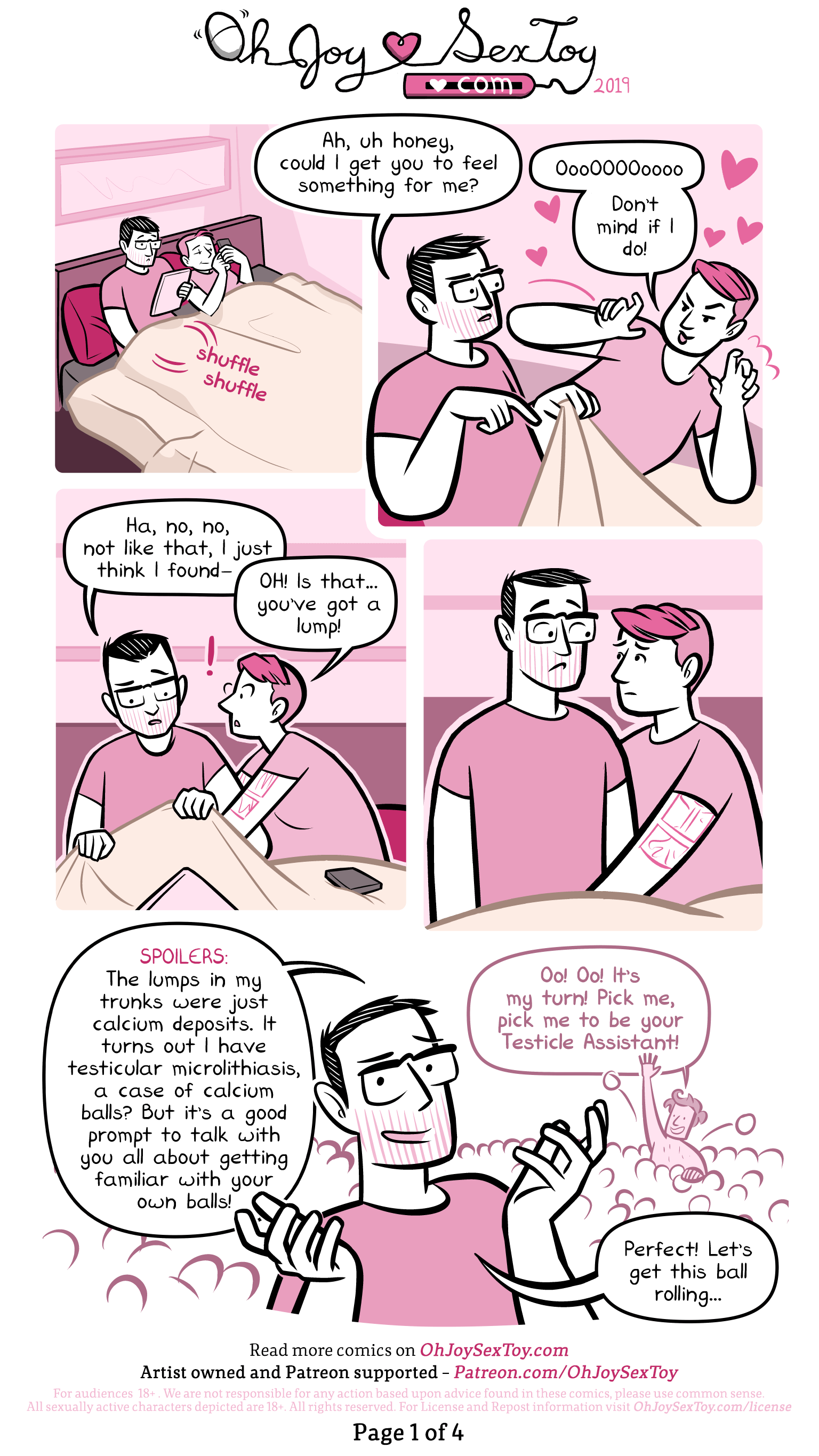 Matthew comes into the next panel. He shrugs as he says, “SPOILERS: The lumps in my trunks were just calcium deposits. It turns out I have testicular microlithiasis, a case of calcium balls? But it’s a good prompt to talk with you all about getting familiar with your own balls!”