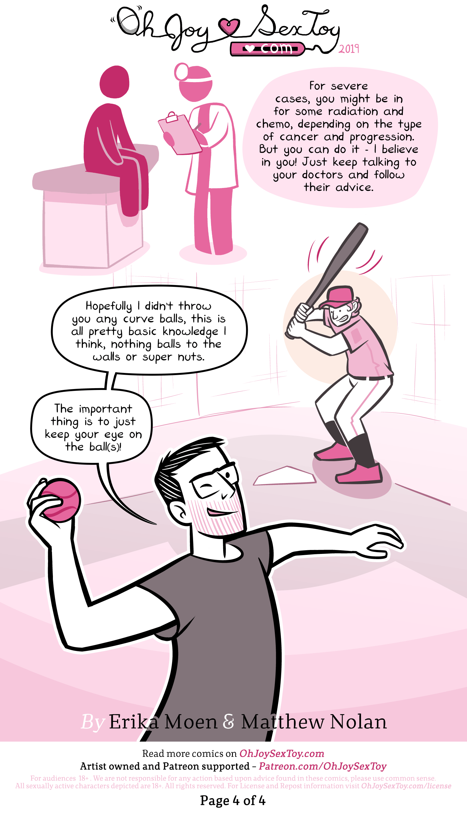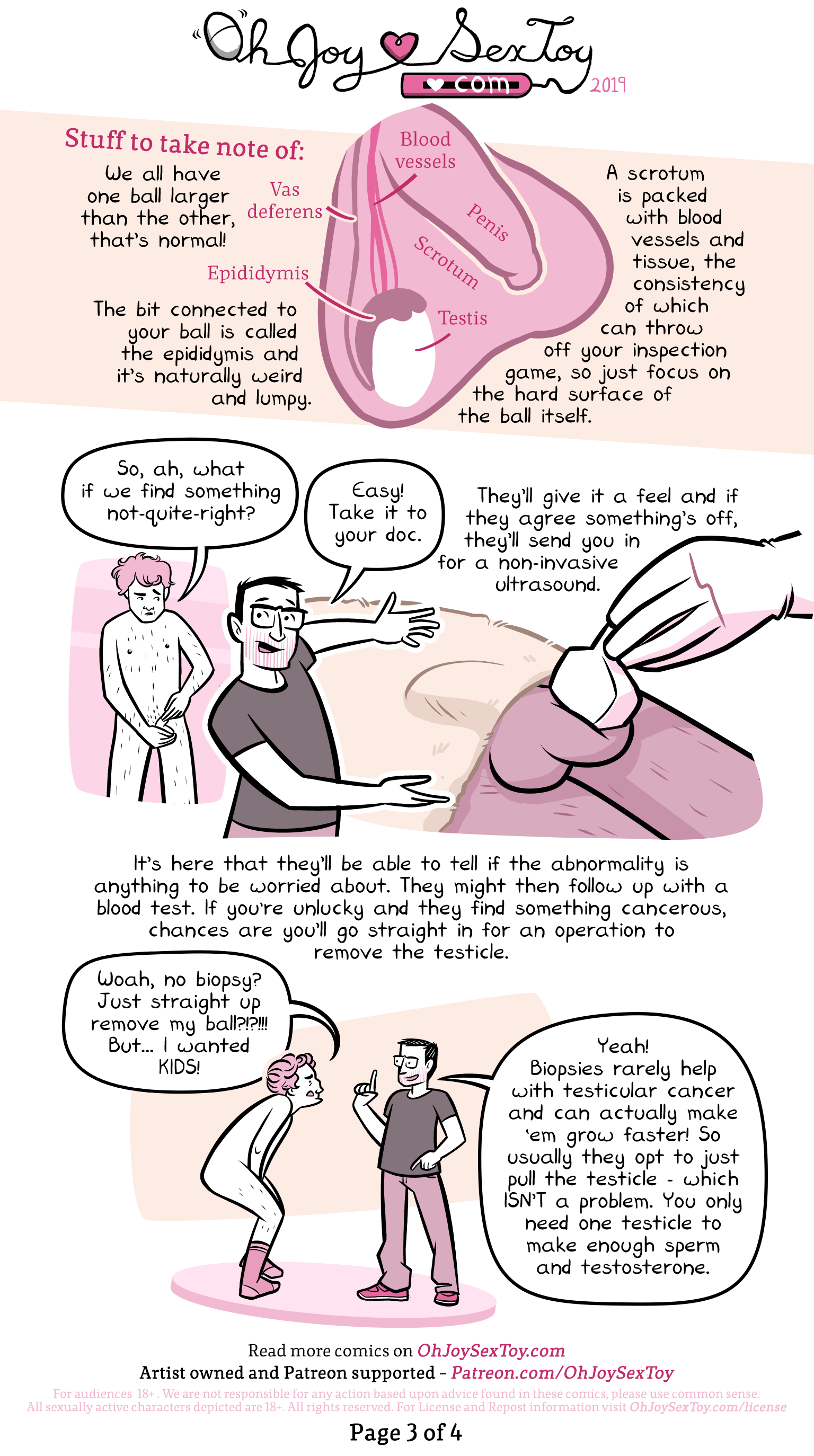 Matthew raises a finger as he responds. “Yeah! Biopsies rarely help with testicular cancer and can actually make ‘em grow faster! So usually they opt to just pull the testicle - which ISN’T a problem. You only need one testicle to make enough sperm and testosterone.” He points down at his crotch as he says this.