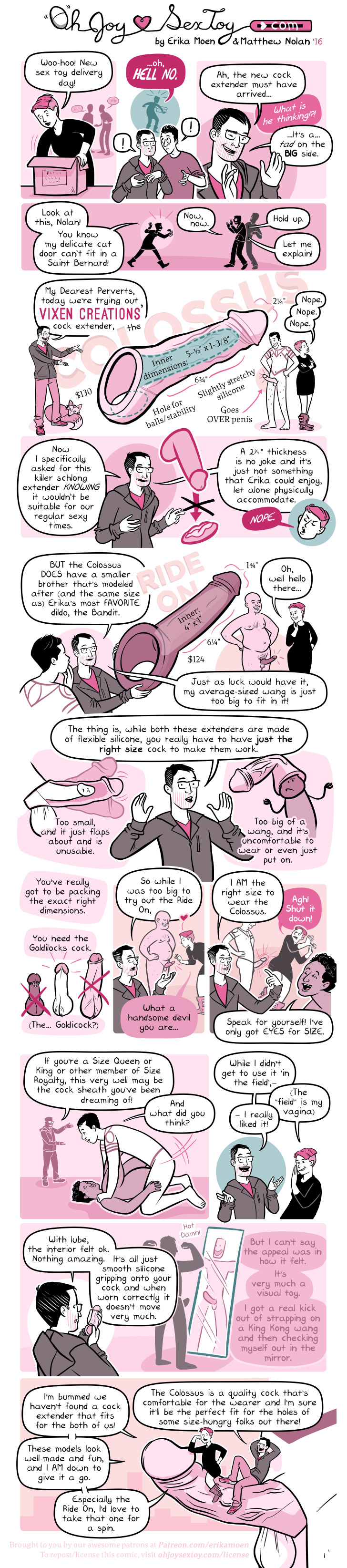 Something I didn’t really go into with this comic is how tricky it can be to slide these extenders on. Vixen has quite the ‘how to’ that’s a balancing act of copious water-based lube, creating a vacuum in the toy for entry, and shifting into position. It’s a bit intense and worth a few practice runs by yourself before trying to put it on in front of a partner.