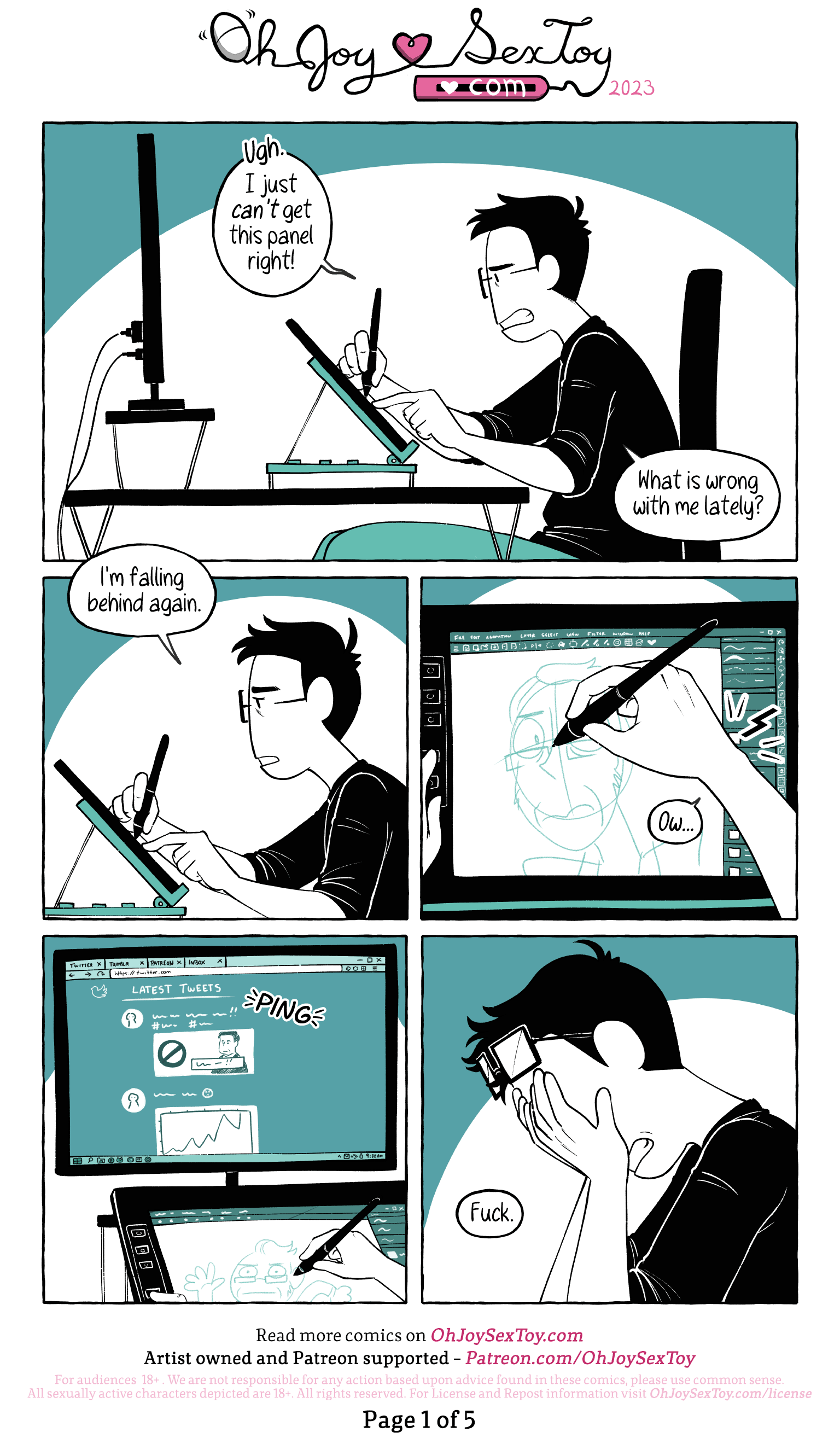 Jey is sitting at their computer while working on comics on a display tablet. They're frustrated. ""Ugh. I just can't get this panel right! What is wrong with me lately?""