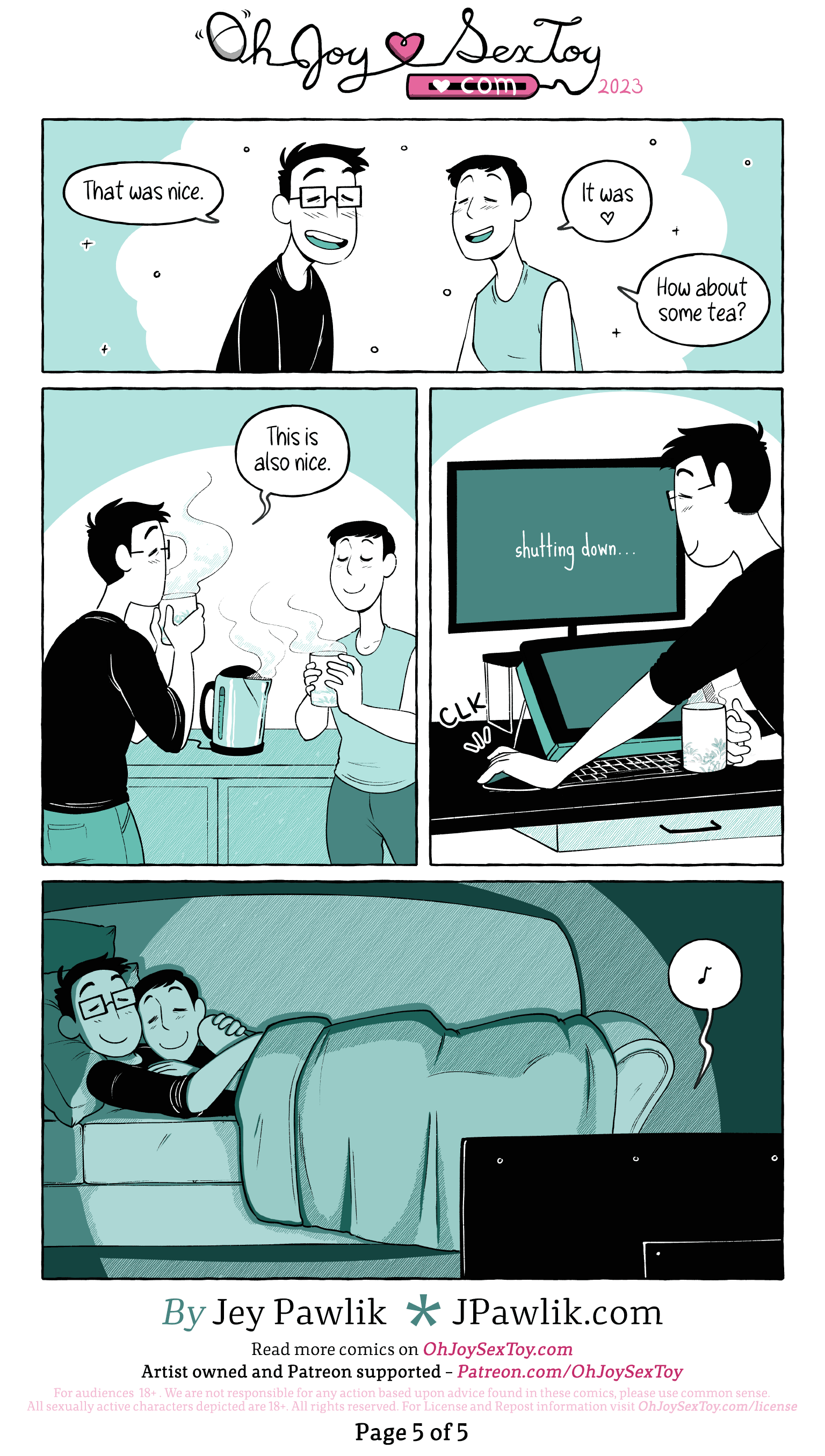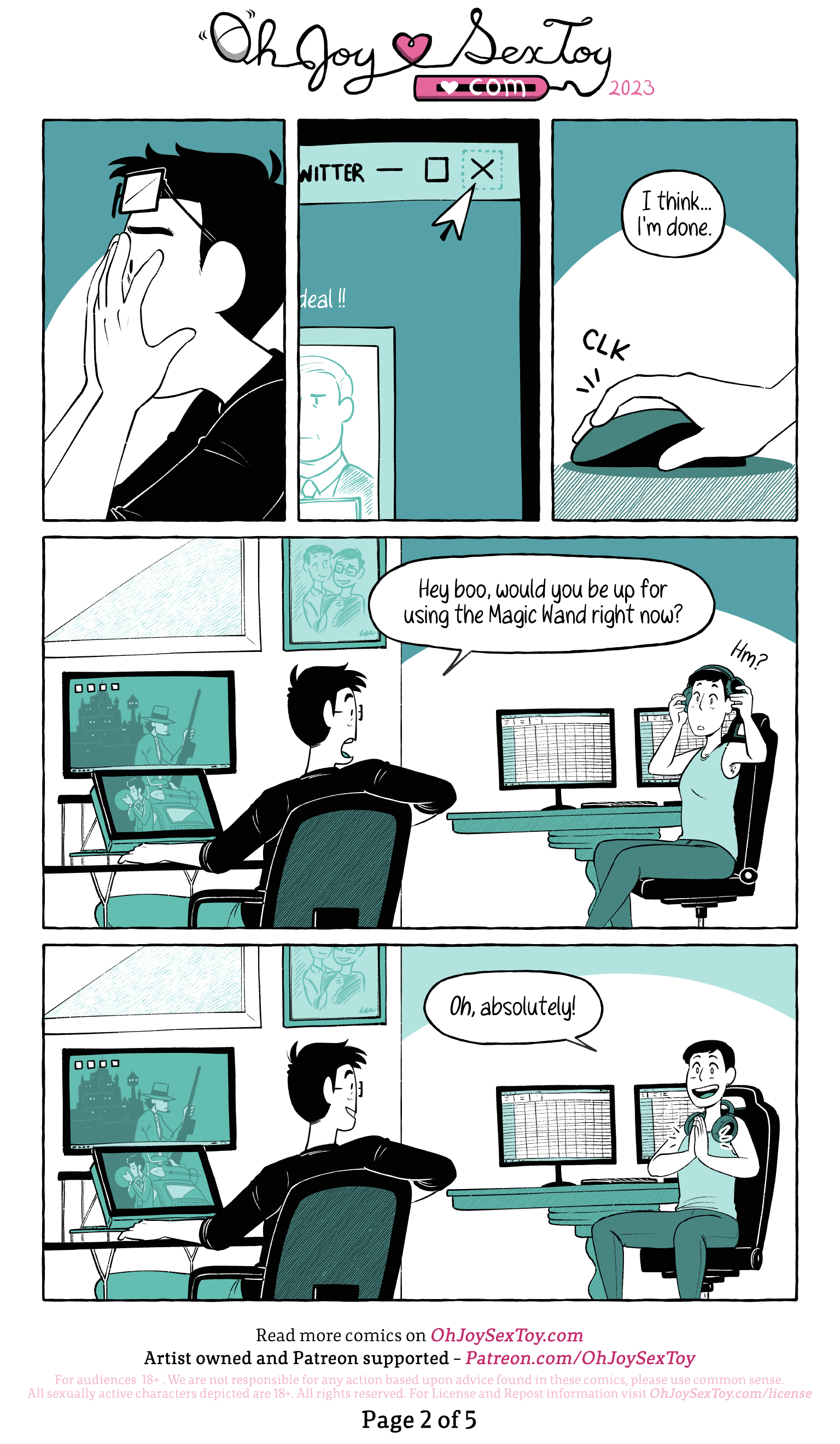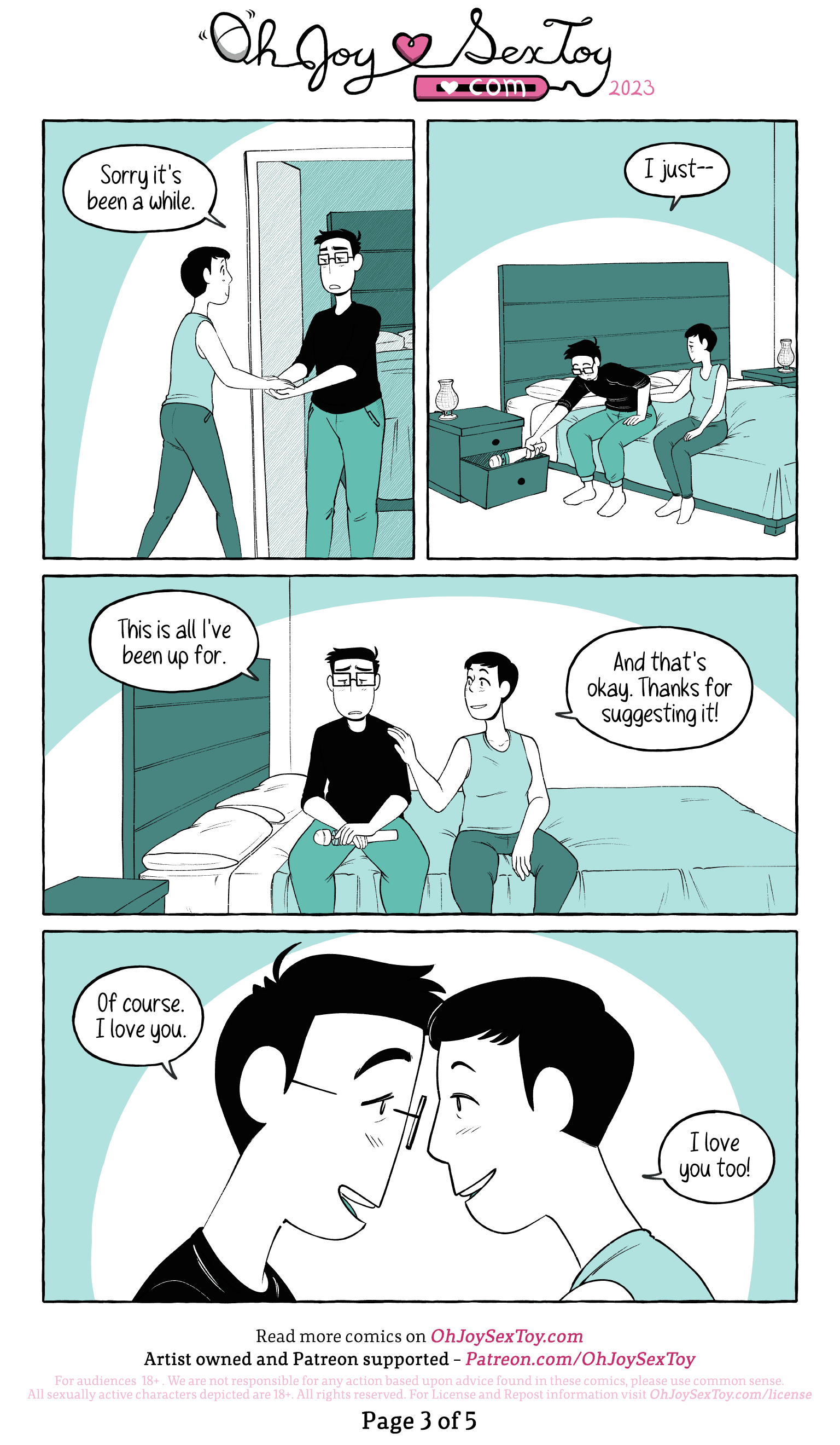 The two hold hands as they make their way to the bedroom. Jey is still looking upset, but pulls out the Magic Wand from the bedside table. Max has a hand on Jey's back as a conversation happens in narration bubbles ""Sorry it's been a while. I just-- This is all I've been up for."" with Max responding ""And that's okay. Thanks for suggesting it!""