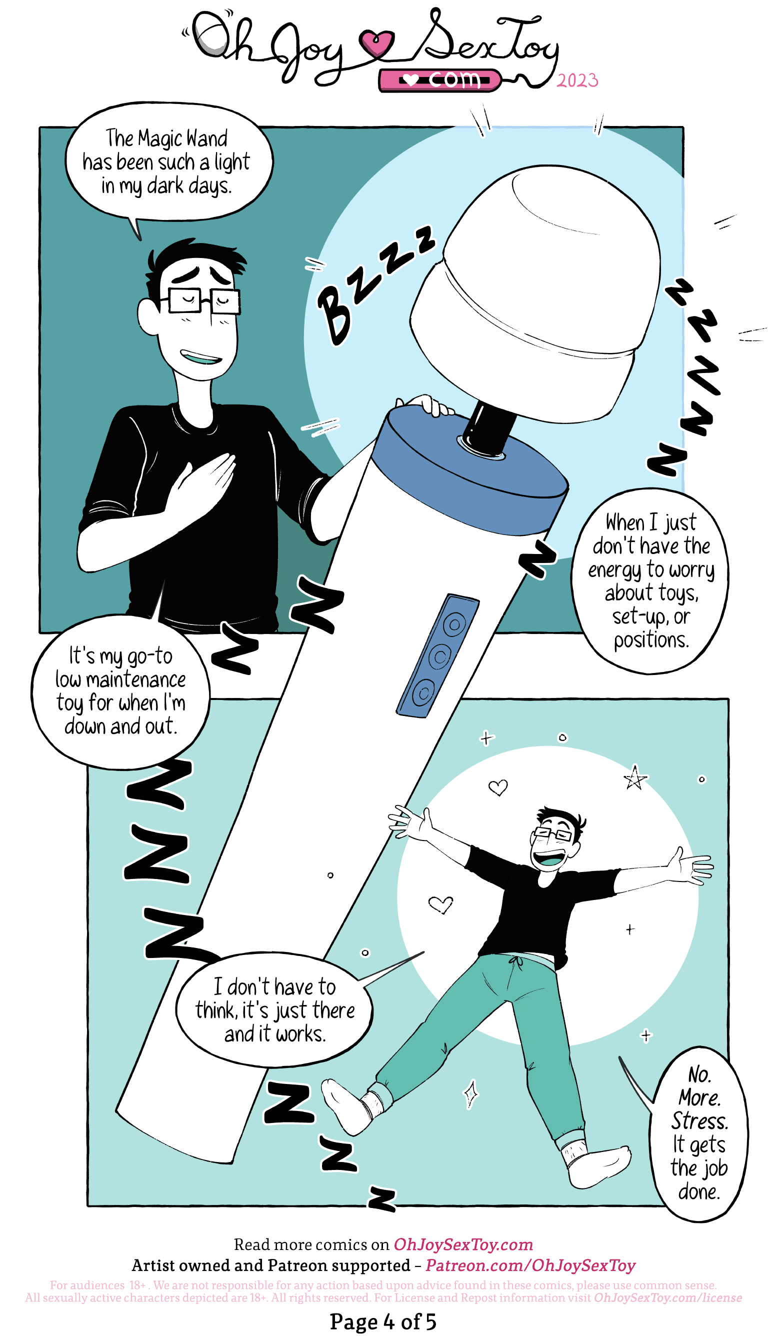 A large drawing of the rechargeable Magic Wand is floating over the two panels on the page. It's the brightest thing on the page with the backgrounds for the panels being fairly dark (but not overpowering). In the first panel Jey's hand rests on the head of the wand and they have my eyes closed with a calm smile on their face. The buzzing sound effects swirl around the wand.