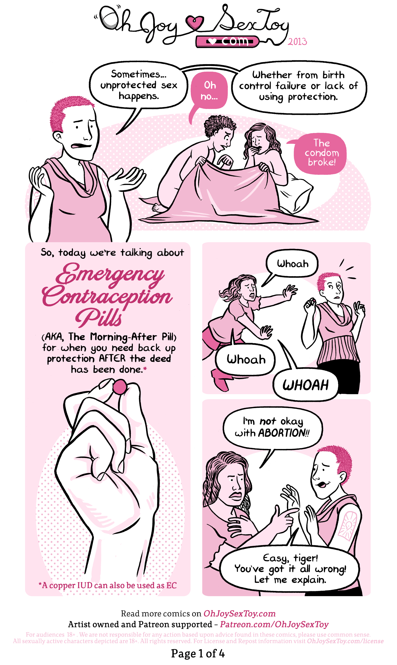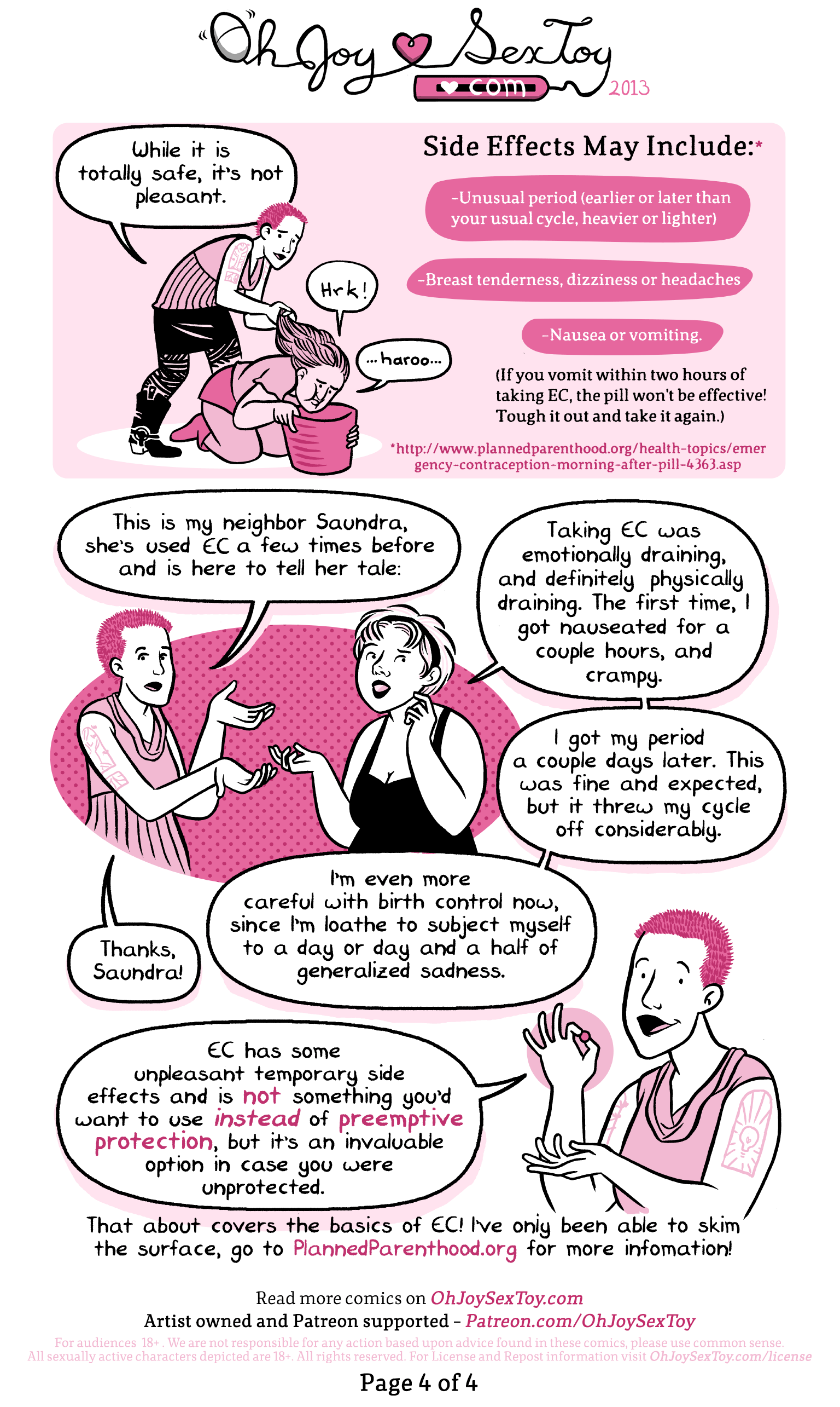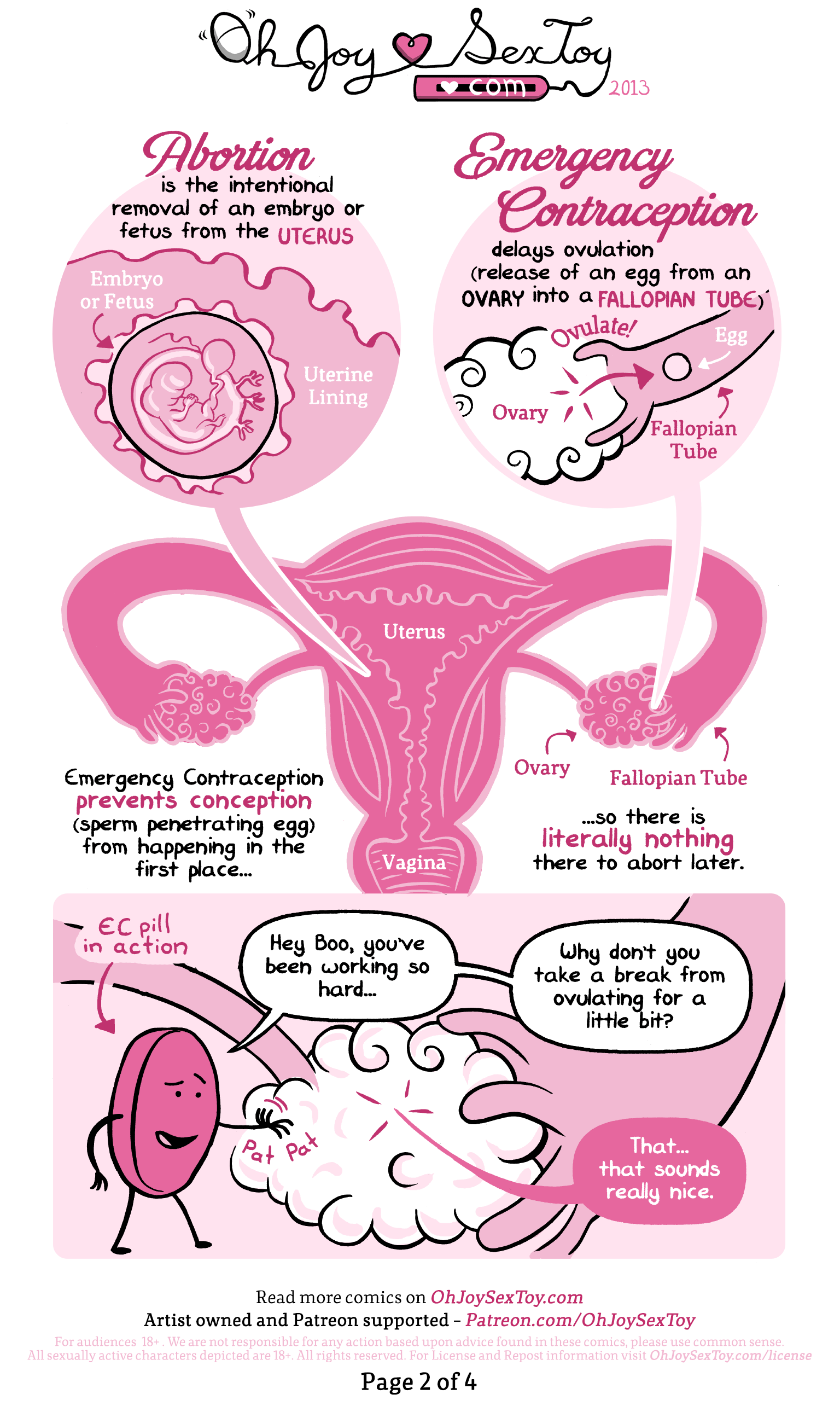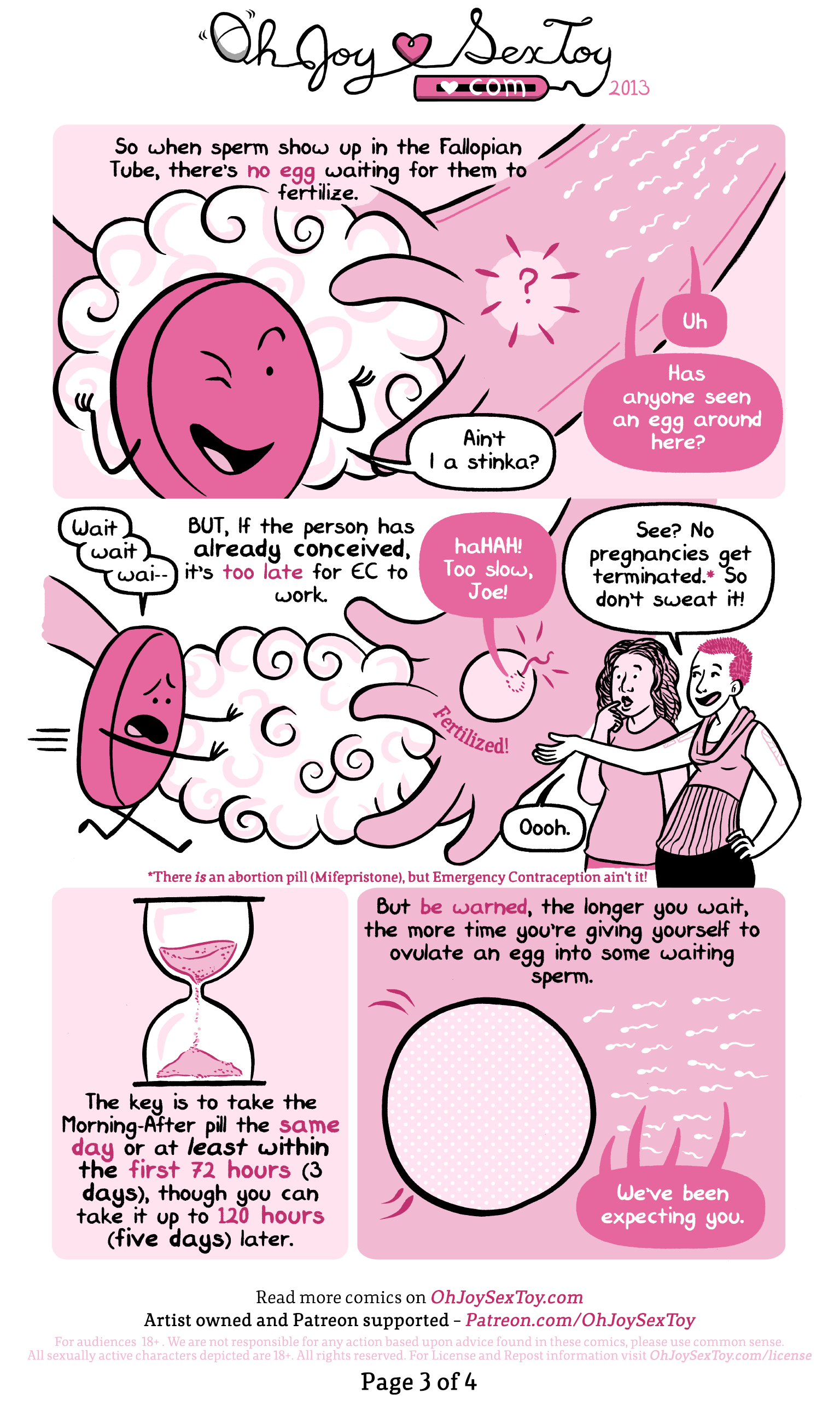 Like it says above, this comic just covers the basics of how emergency contraception pills work (and if you need a refresher, I explained how conception and pregnancy work earlier!). I encourage you to read up more on this method of emergency birth control over at Planned Parenthood!
