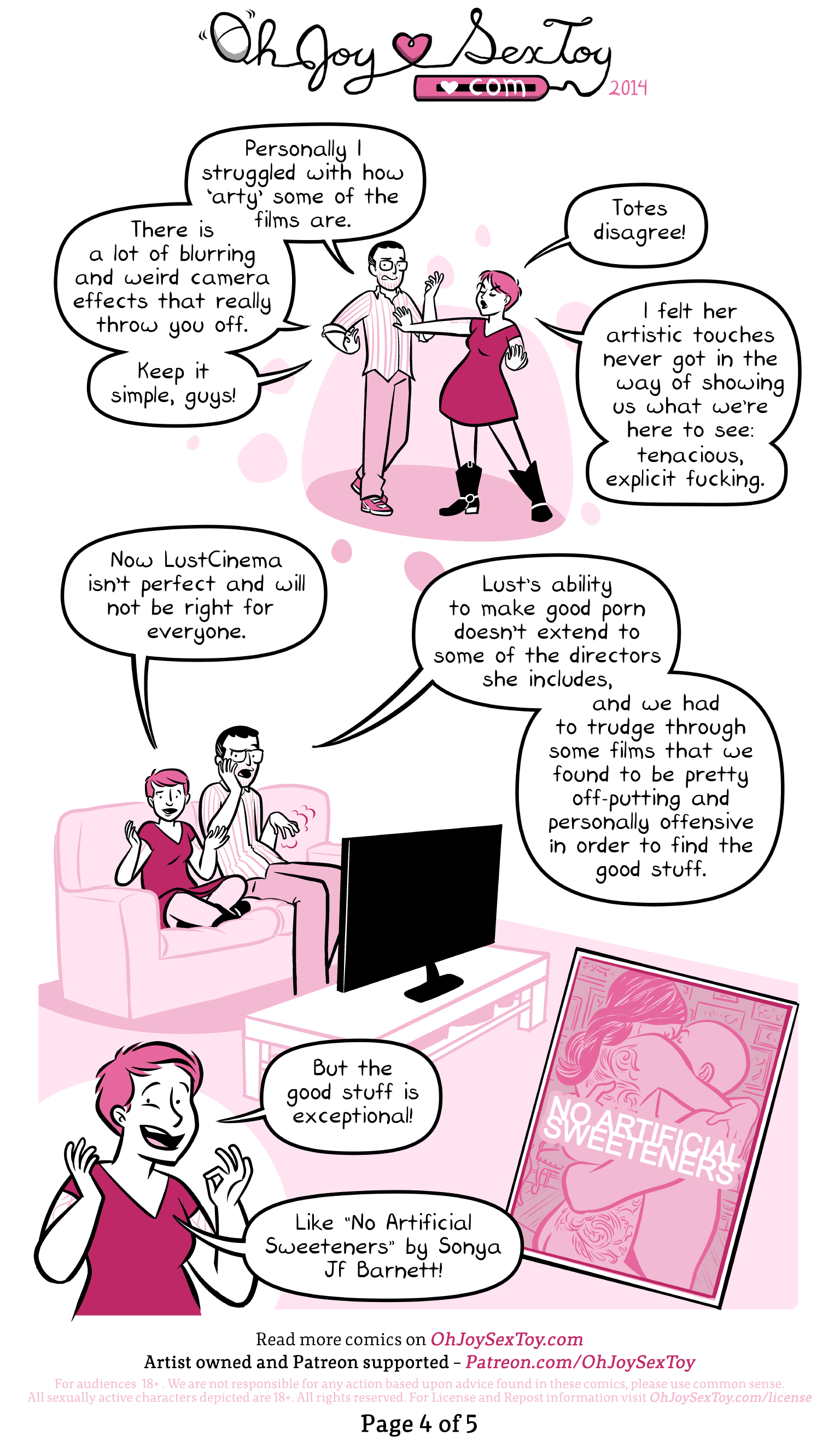 Back on the couch in front of their TV, Erika resumes, "Now LustCinema isn't perfect and will not be right for everyone."