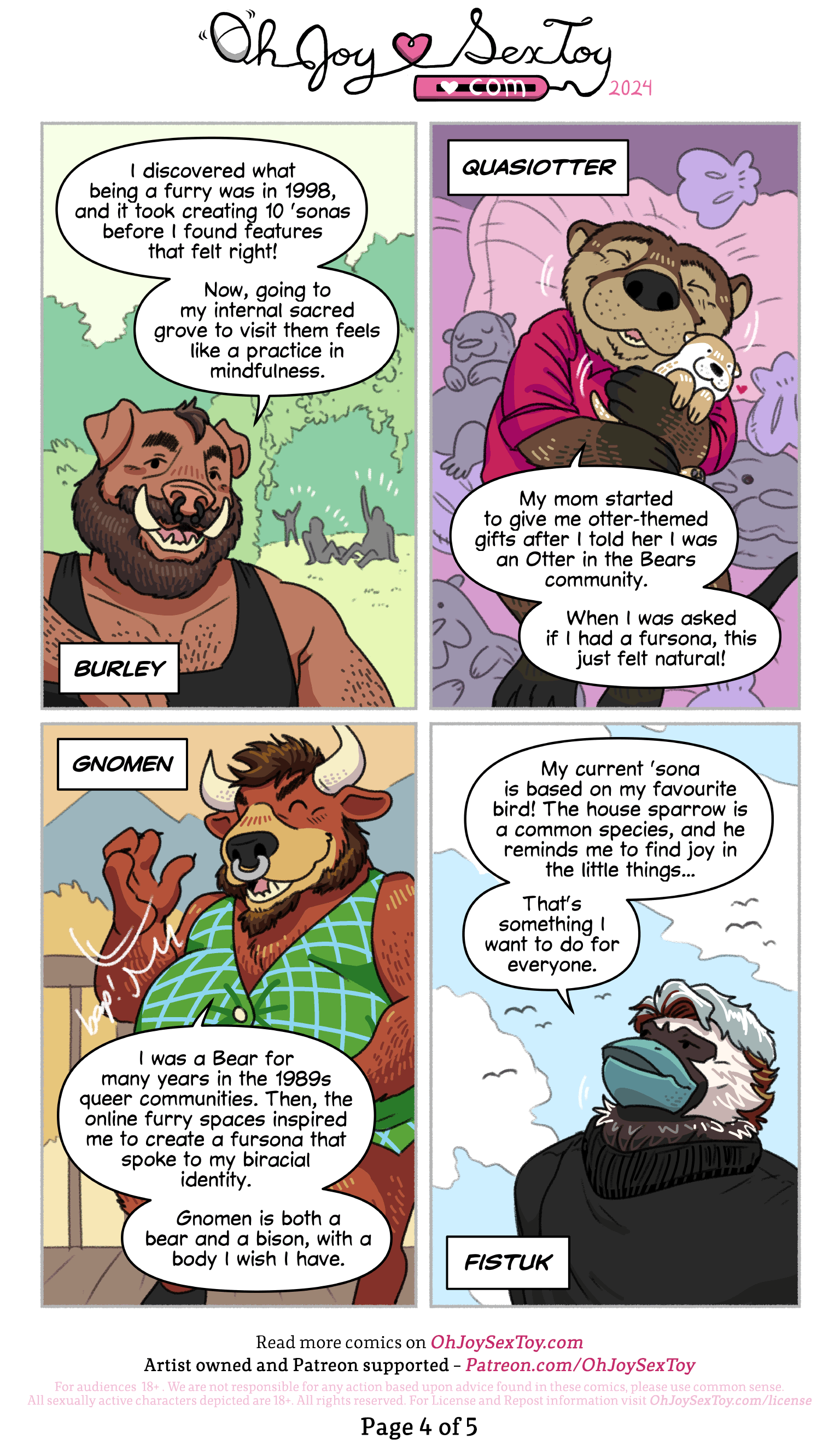 This page is cut up into four equally sized panels. Each one is a little vignette-style interview with a different anthropomorphic person who explains how they came about their first fursona.