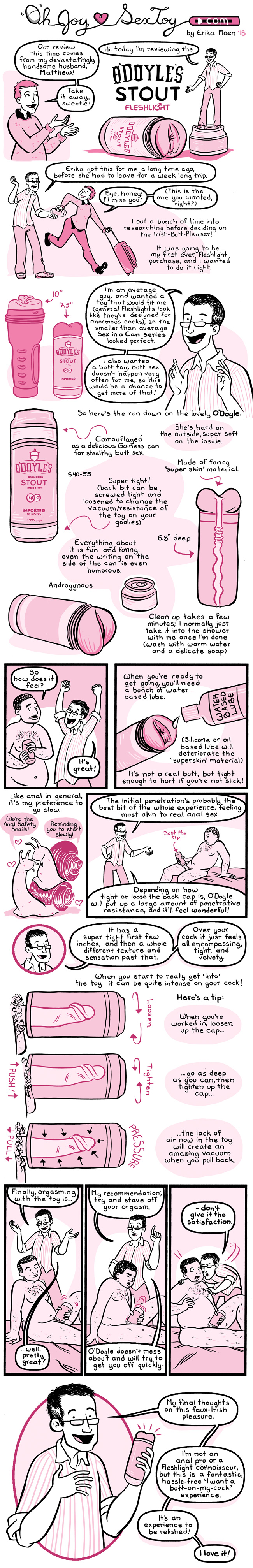 Matthew, looking quite cheery and innocent, pops out of an oval-shaped panel as he starts his conclusion. He holds the O’Doyle up and says, “My final thoughts on this faux-Irish pleasure. I’m not an anal pro or a Fleshlight connoisseur, but this is a fantastic, hassle-free, “I want a butt-on-my-cock experience. It’s an experience to be relished. I love it!”