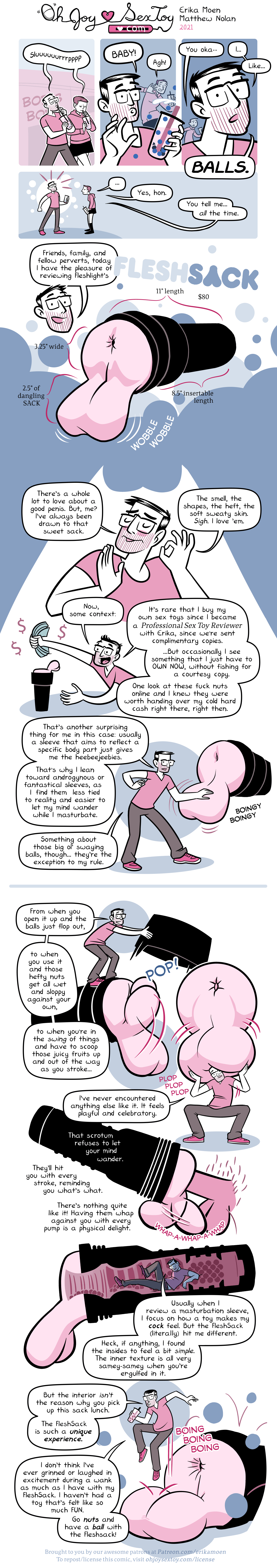 When I first ran into the FleshSack (yes I know, that name 0_o), I thought it was some sort of FleshLight Aprils fools. It seemed so out of place amongst all the orifice-focused toys they make, and definitely not something that would appeal to me. But I was shocked by how much horny mental space it decided to occupy in my head. Balls on a Fleshlight; after all… why not? Why shouldn’t I keep try it? What started as a giggle turned into a must have. I HAD to experience those balls slappin’ up against me. A rare purchase for me.