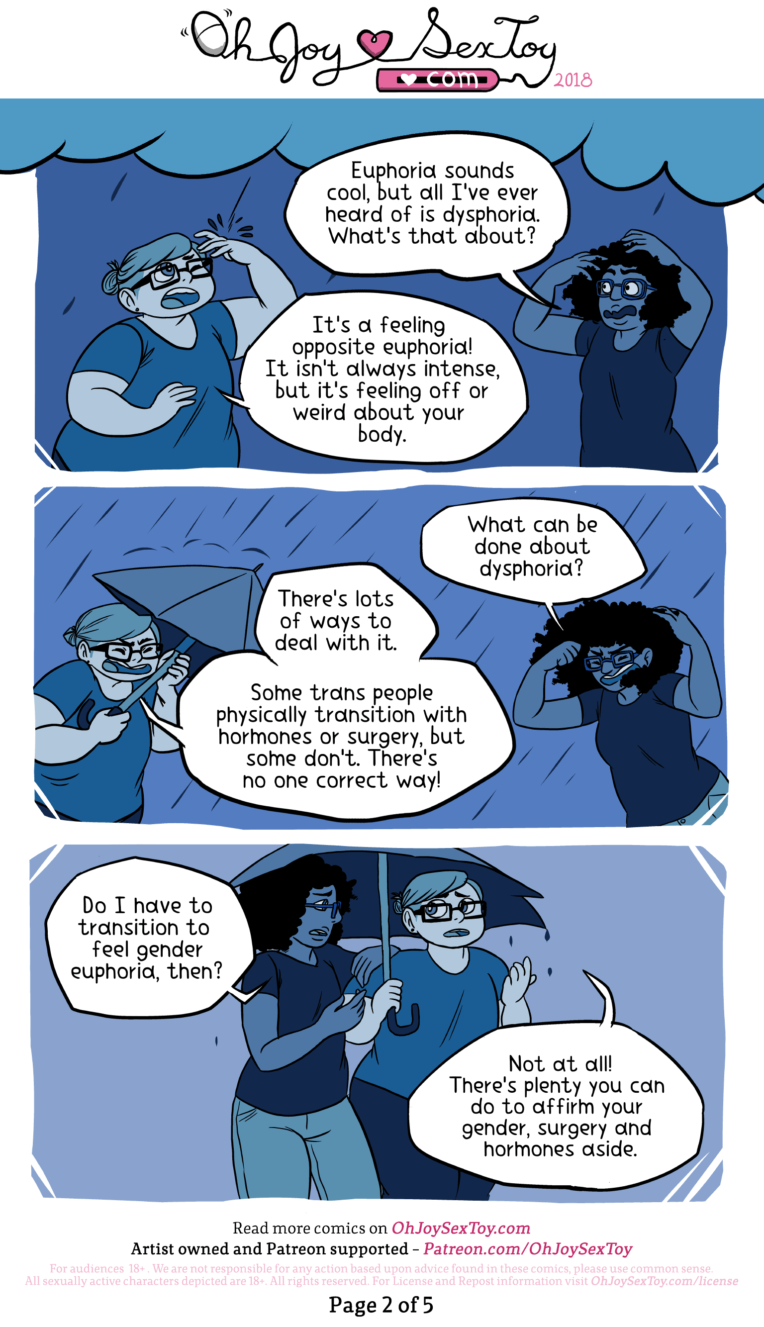 "Euphoria sounds cool, but all I've ever heard of is dysphoria." The friend asks, while shielding their head from the rain with their hands. "What's that about?"
