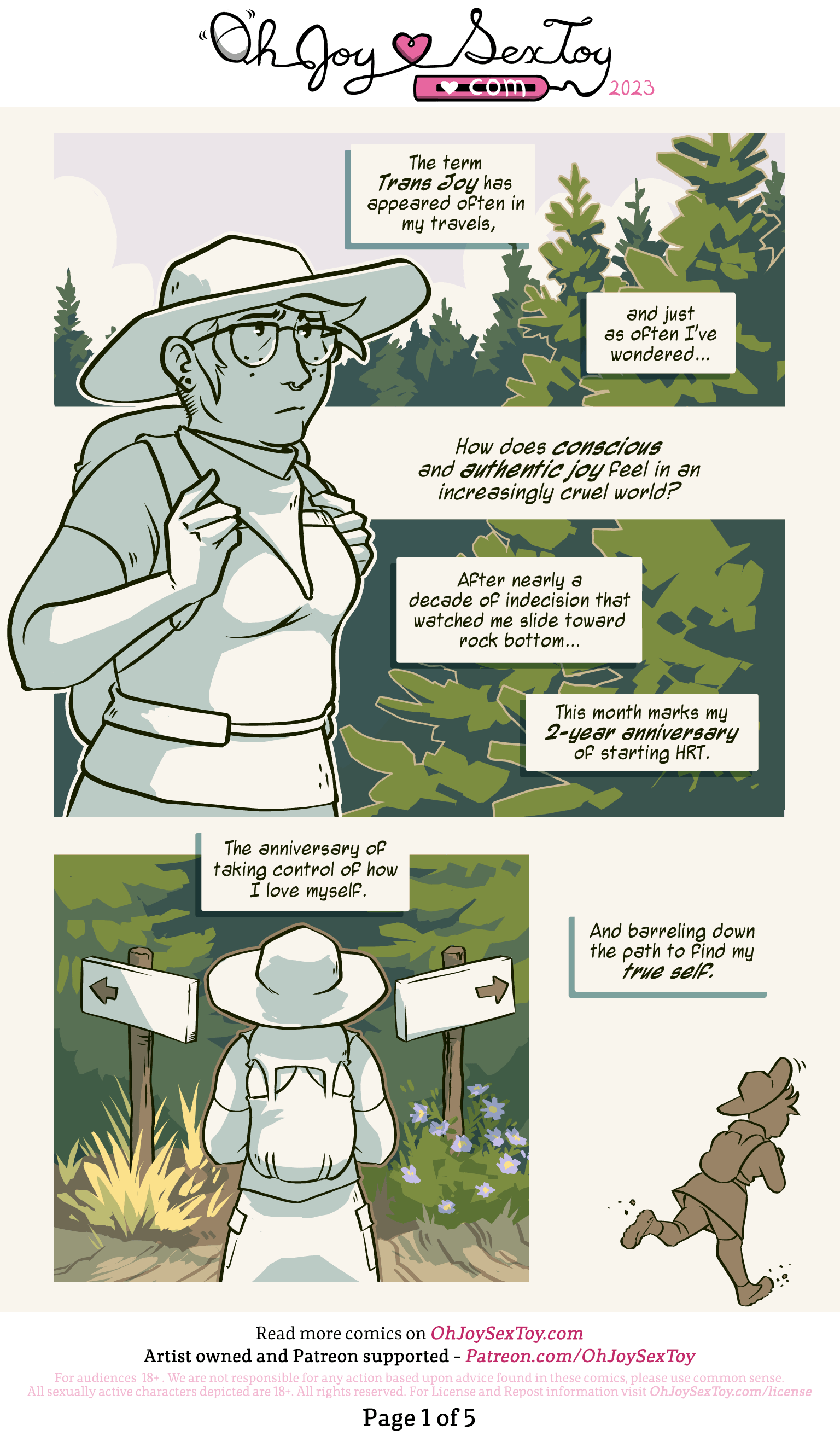 Around them, the narrator says, "The term Trans Joy has appeared often in my travels, and just as often I've wondered... How does conscious and authentic joy feel in an increasingly cruel world? After nearly a decade of indecision that watched me slide toward rock bottom... This month marks my 2-year anniversary of starting HRT."