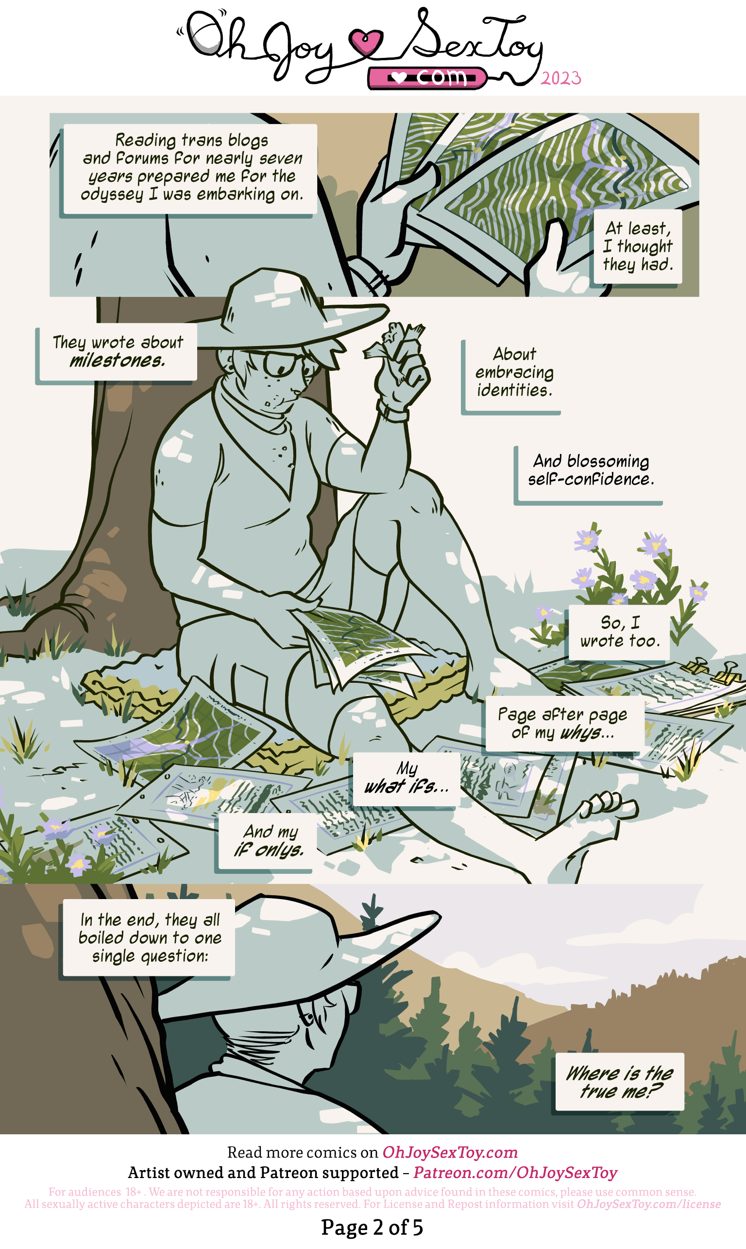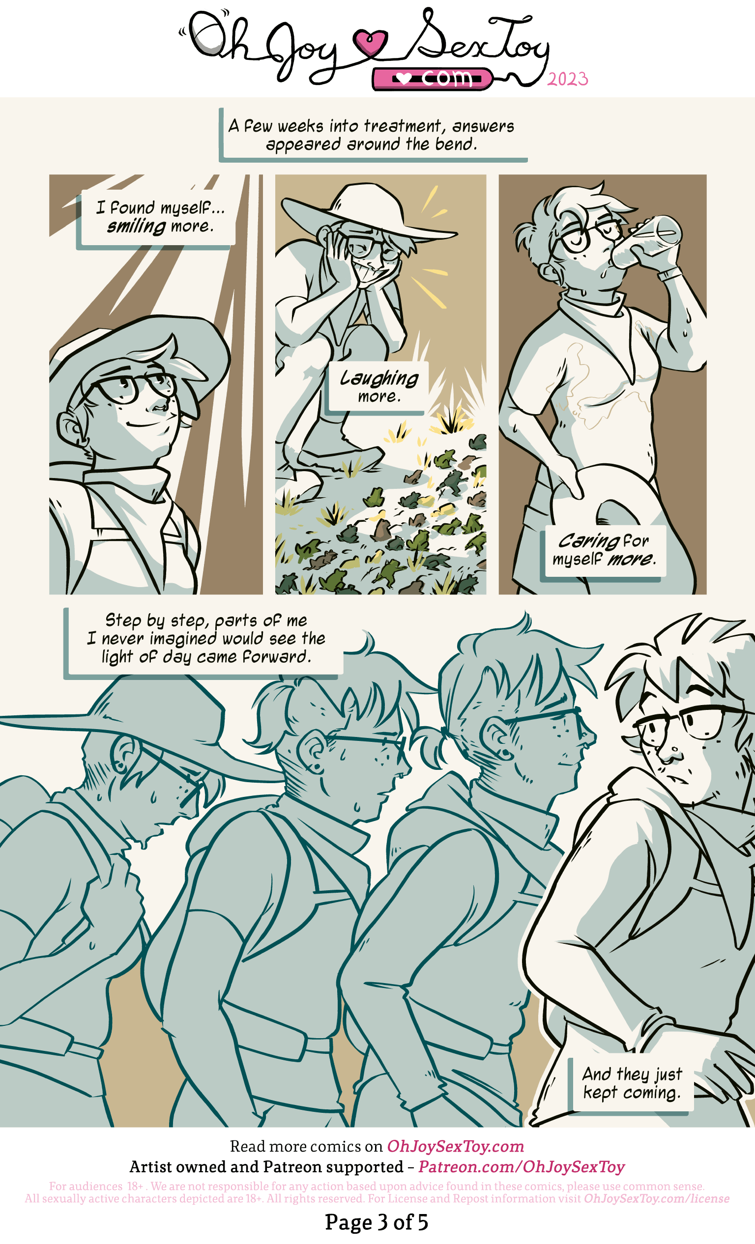 In a single panel, four versions of Ripley cross the distance. On the furthest left they are sweating and painting, struggling with exhaustion. The back of their head is closely buzzed while their bangs and side locks hang down from under the brim of their hat. As they progress across the middle of the panel, Ripley loses the hat and proceeds to walk more upright, sweating less with each step. Their locks of hair grow out (while remaining buzzed on the sides) until they have a mini-pony tale. The narration explains, "Step by step, parts of me I never imagined would see the light of day came forward. And they just kept coming." At the farthest right side of the page, Ripley looks over their shoulder at their past selves.