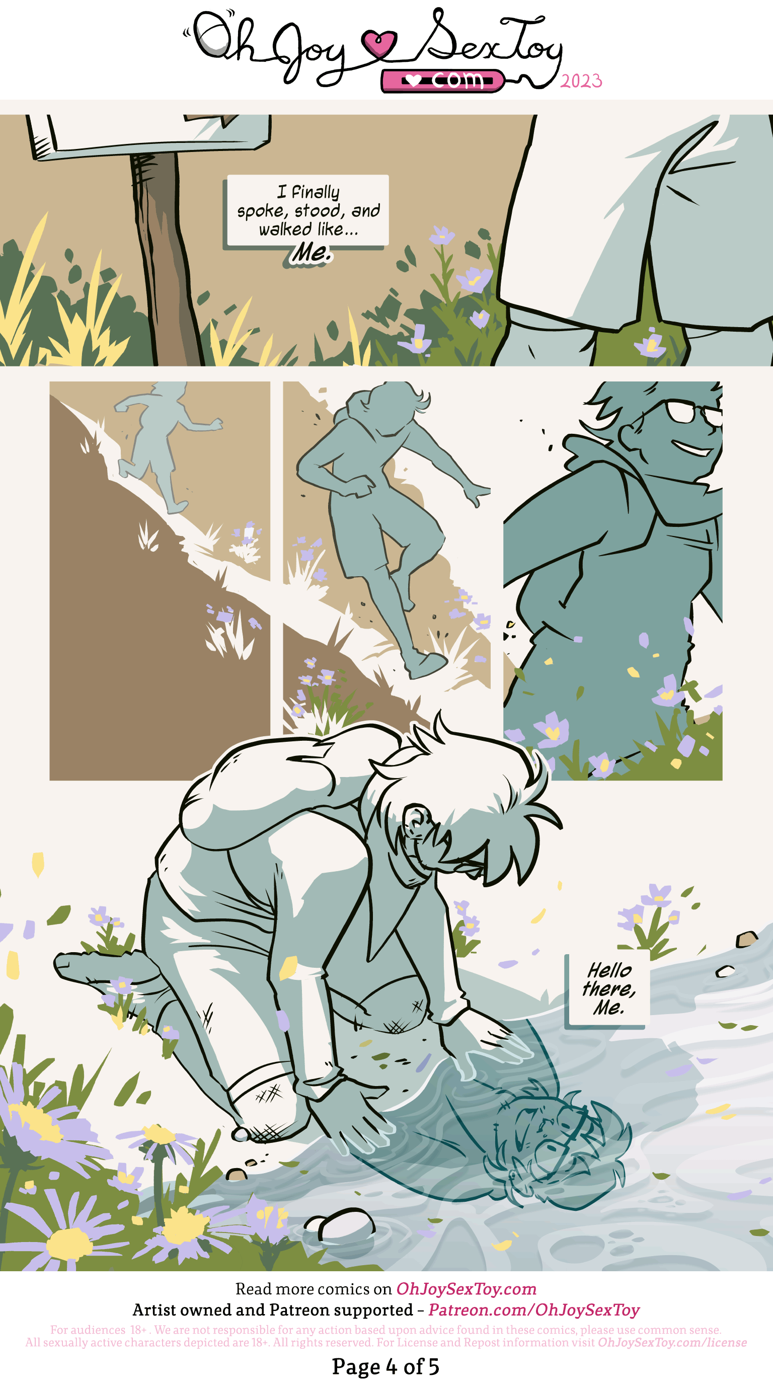 The narration reads, "I finally spoke stood, and walked like... Me." as Ripley stands before a new signpost with an arrow pointing to the right. Small wildflowers and grasses bloom at their feet. Gaining momentum, Ripley takes off down the skinny descending path, joy breaking through them as they careen to the bottom and kneel at a stream. "Hello there, Me." the caption says as Ripley smiles at their reflection in the water, their fingers dipped into the stream with purple and yellow wildflowers blooming around them.
