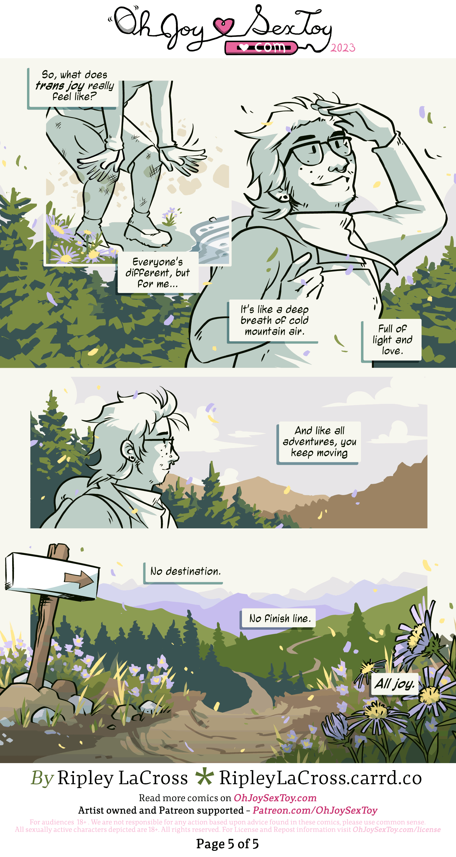 As they brush the dirt from their knees, Ripley's narrator asks, "So, what does trans joy really feel like?" Ripley shields their eyes as they look upwards, smiling, and the wind blows bits of petals and pollen around them. "Everyone's different, but for me... It's like a deep reath of cold mountin air. Full of light and love."
