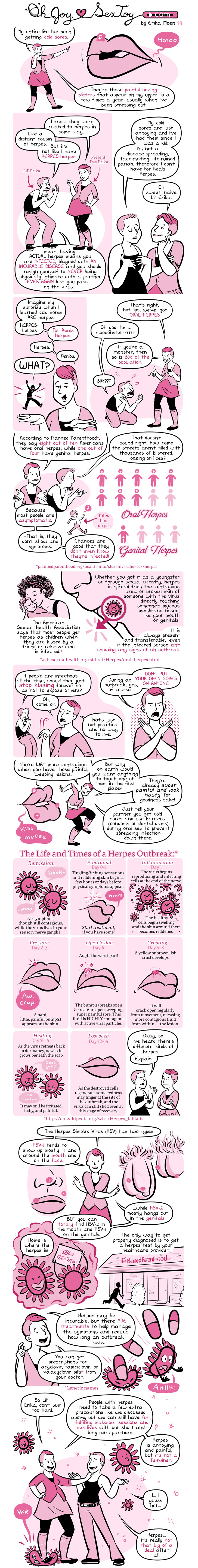 Oh gosh, there is SO MUCH MORE to learn about herpes than I had space here! Here are some resources on herpes from Planned Parenthood, Wikipedia (Oral and Genital), and the American Sexual Health Association‘s page on oral herpes. SUPER IMPORTANT: if you’re having a herpes outbreak wash your hands a lot because if you touch that viral fluid weeping from your sore and then touch another part of a body (yours or someone else’s) you can spread the disease.