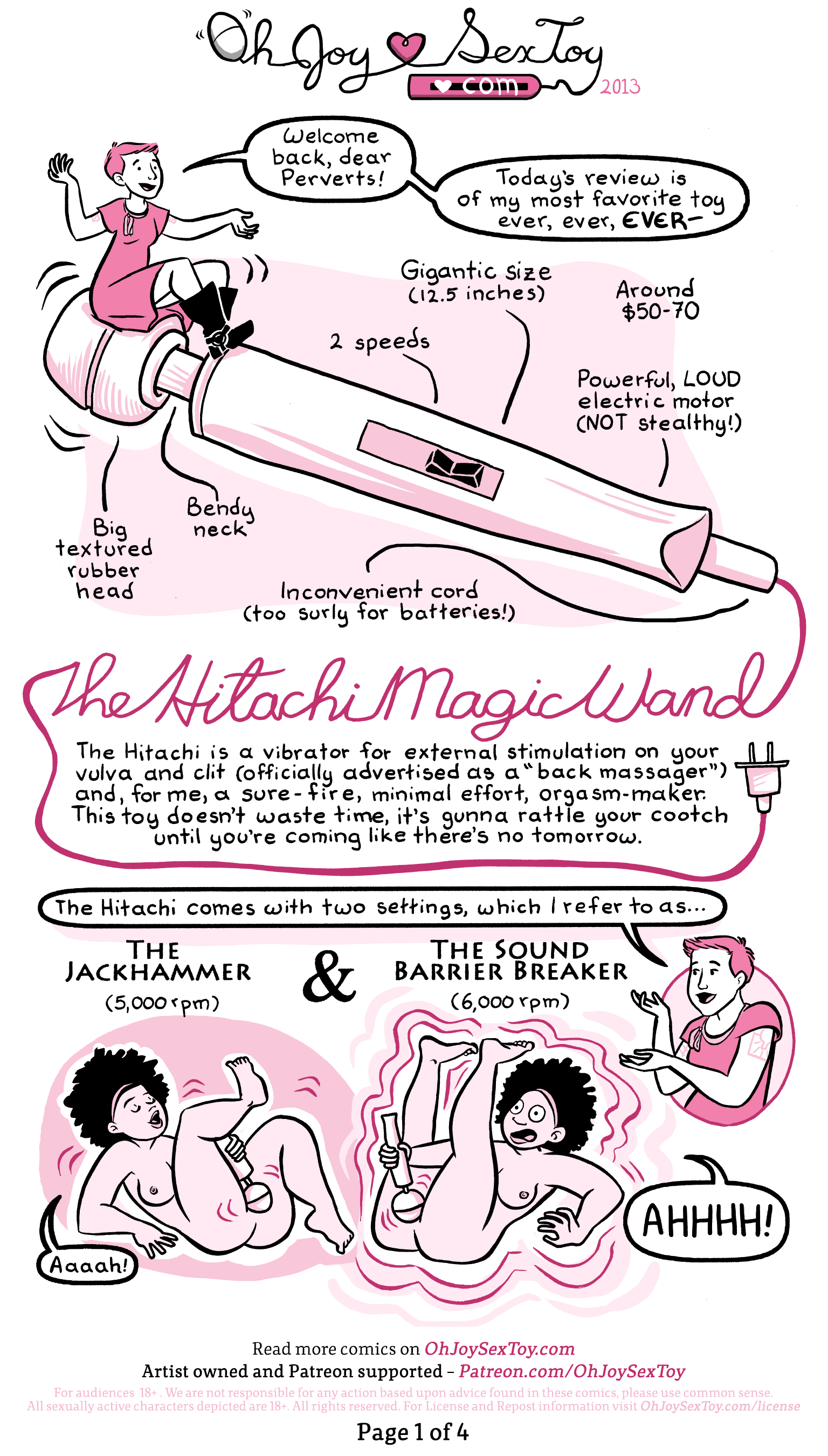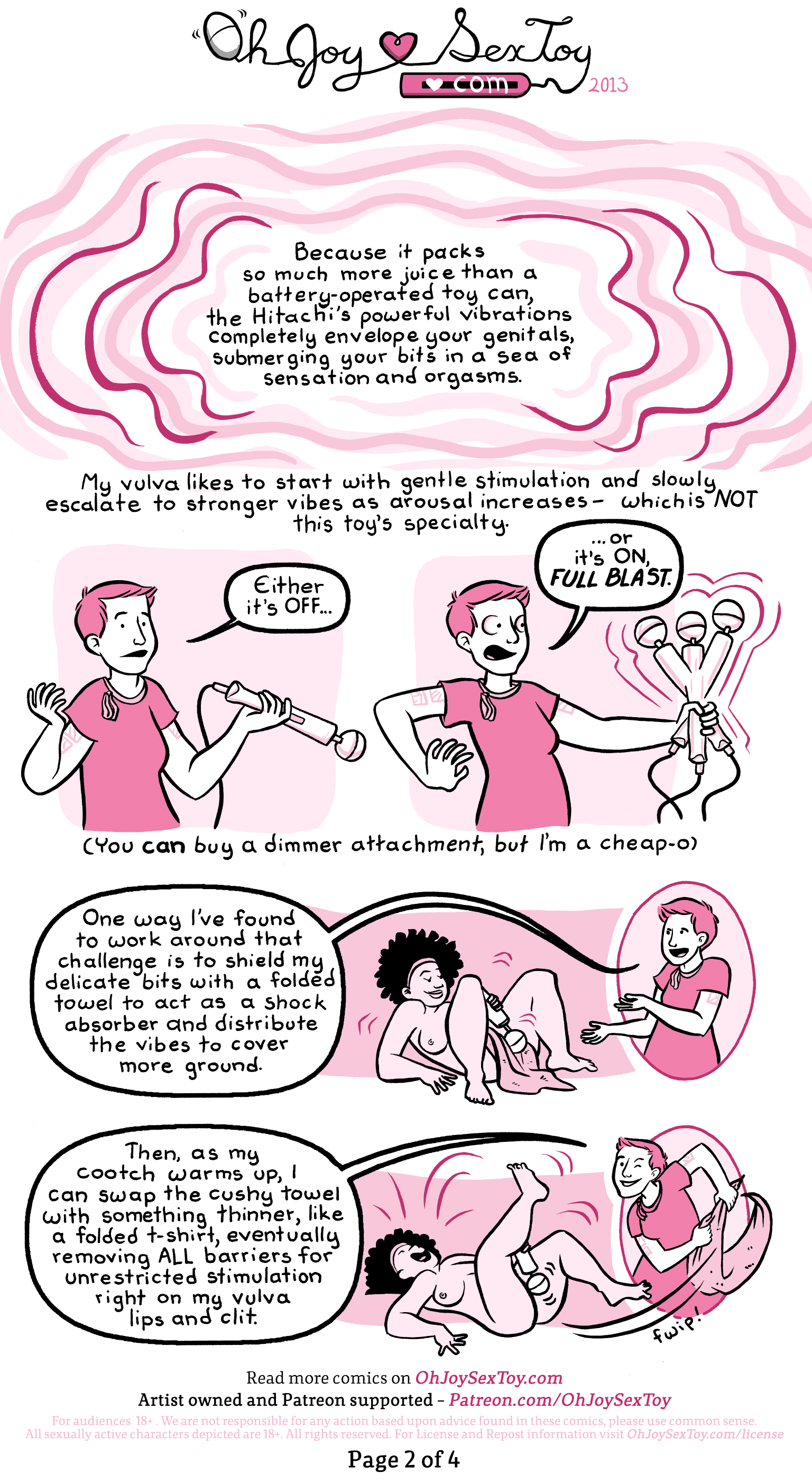 The cord of the wand forms a panel border as Erika narrates: “The Hitachi is a vibrator for external stimulation on your vulva and clit (officially advertised as a “back massager”) and, for me, a sure-fire, minimal effort, orgasm-maker. This toy doesn’t waste time, it’s gunna rattle your cootch until you’re coming like there’s no tomorrow.”