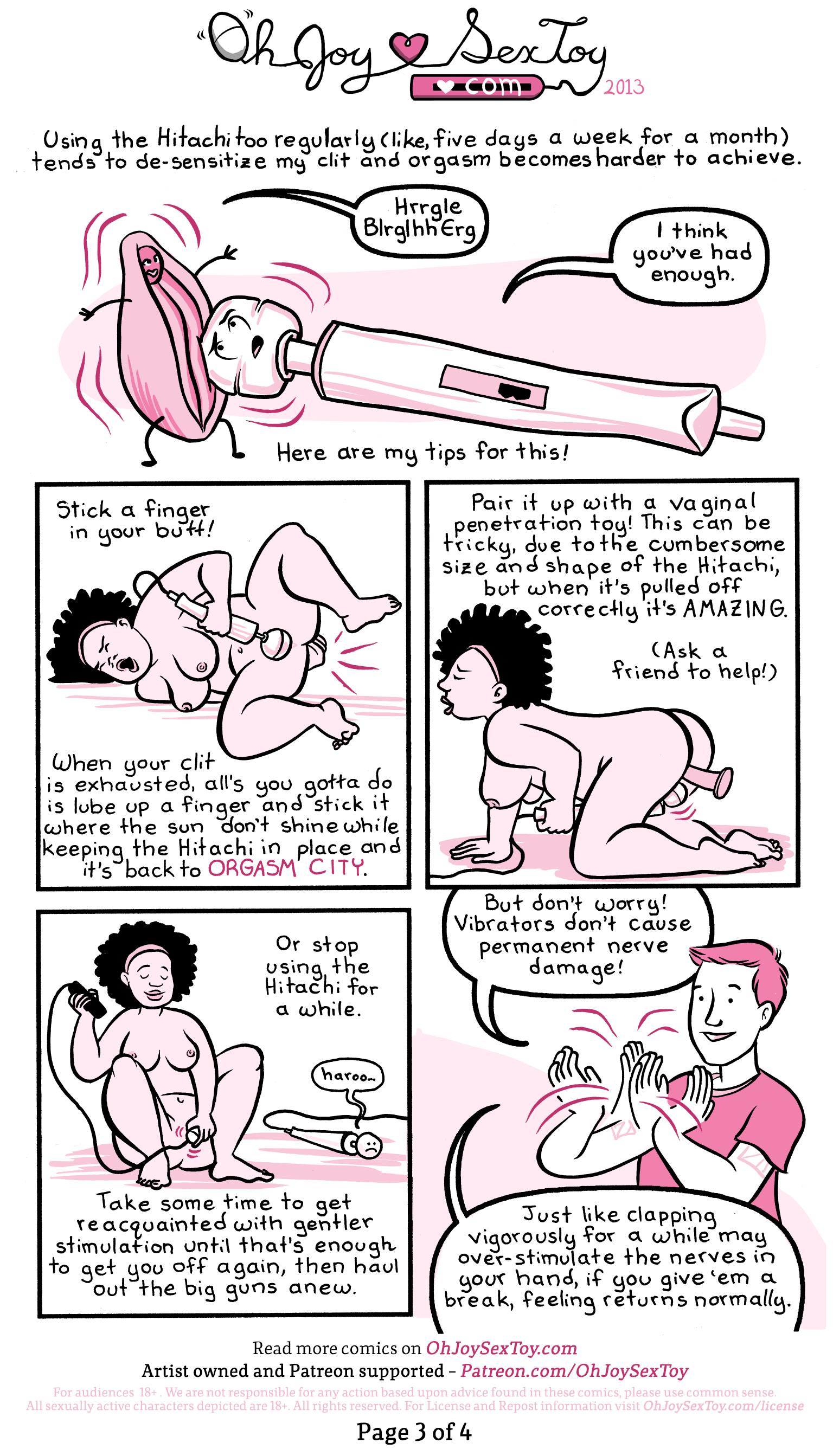 “Using the Hitachi too regularly (like, five days a week for a month) tends to de-sensitize my clit and orgasm becomes harder to achieve.”