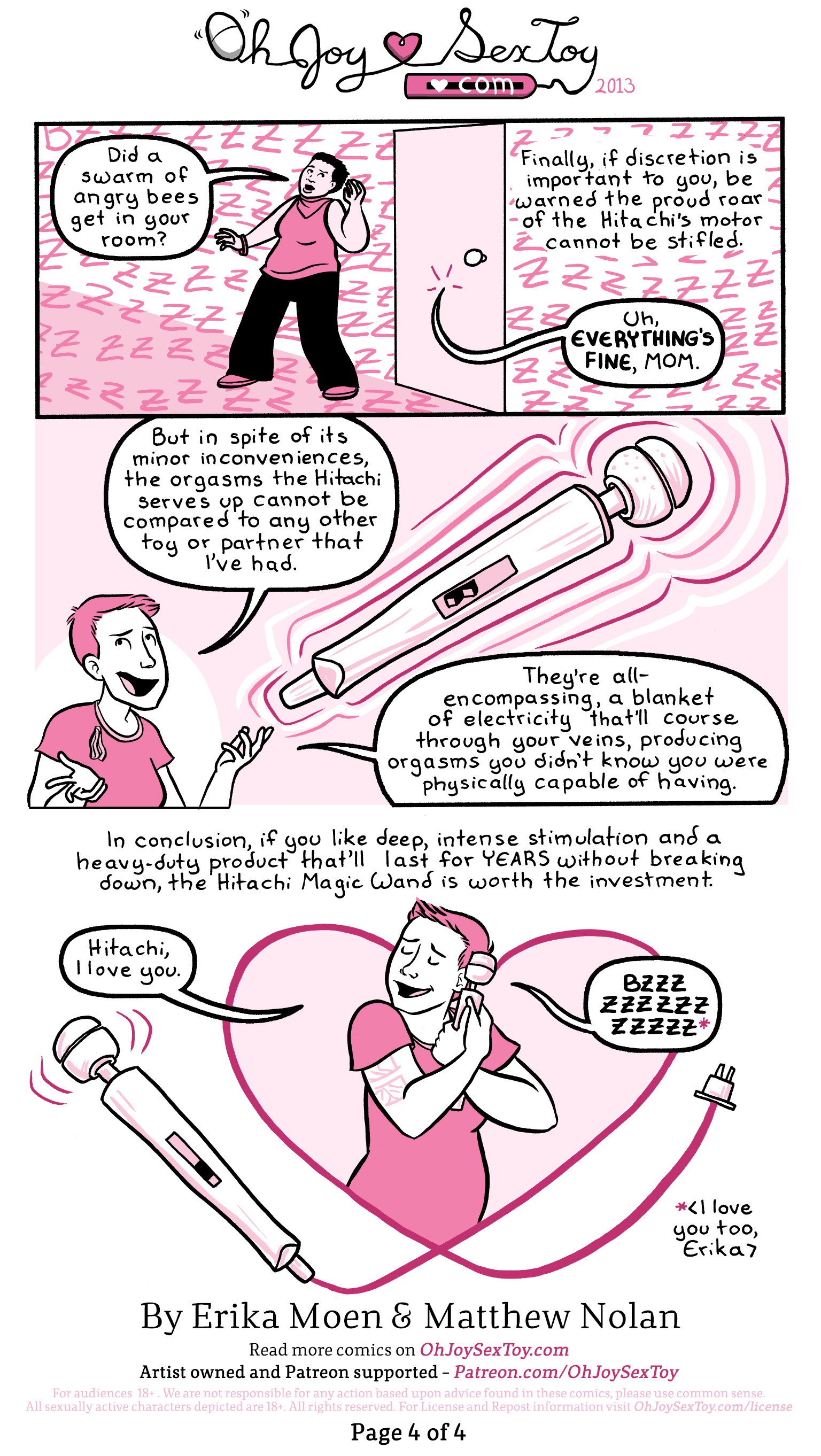Erika ends the comic surrounded by a heart shaped panel made from the cord of the magic wand. She says, “Hitachi, I love you,” as she gives it a tight hug. The wand buzzes back a sweet, “I love you too, Erika”.