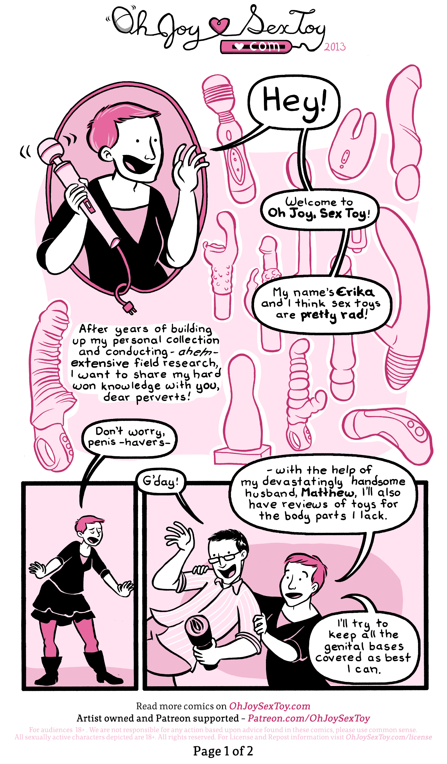 She pulls in her husband from off-panel, who is smiling and waving at the reader while holding a fleshlight in his other hand. “G’day!” he says. He is a white man with short black and grey hair and glasses.