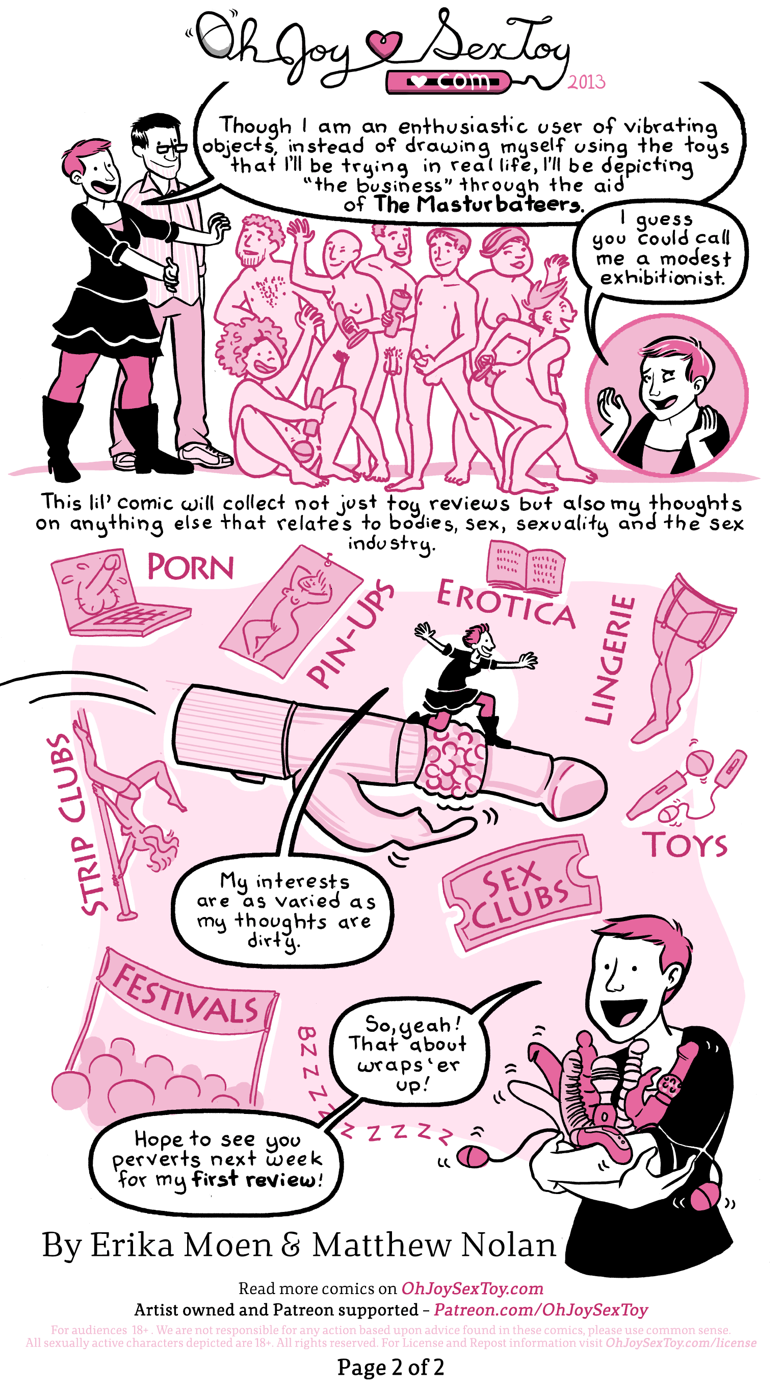 “This lil’ comic will collect not just toy reviews but also my thoughts on anything else that relates to bodies, sex, sexuality and the sex industry.” Comical doodles of topics like “Porn”, “Pin-Ups”, “Erotica”, “Lingerie”, “Toys”, “Sex Clubs”, “Strip Clubs”, and “Festivals” surround her as she strikes a majestic pose on a giant, vibrating, dildo while the wind blows through her hair. “My interests are as varied as my thoughts are dirty.”