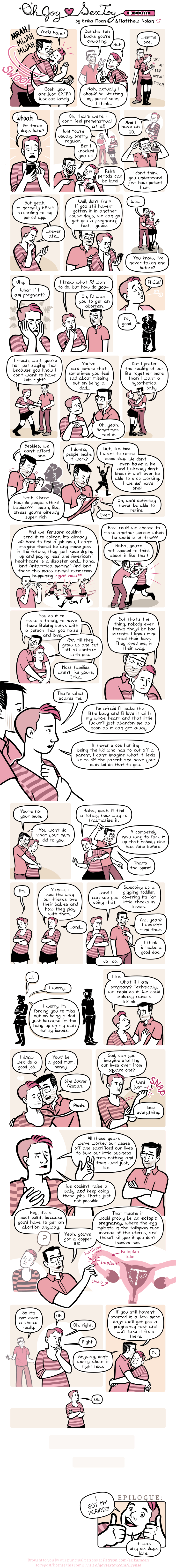 The comic above is the condensed version of the many talks we’ve had over our twelve years together about whether we want to reproduce, but it does not encompass ALL of our reasons and personal details. There wasn’t space to include our omnipresent fears about being bankrupted by a medical emergency for either of us, let alone affording health care for a brand new little person who may or may not need expensive aid. Matt and I both have learning disabilities that make our lives difficult, and I have a mental illness that I fear passing on. Plus, haha, my own family experience left something to be desired and I just don’t want to recreate that situation for some innocent little kid. I dunno, there’s a whole lot more, too! But to list everything would make for a pretty boring read.