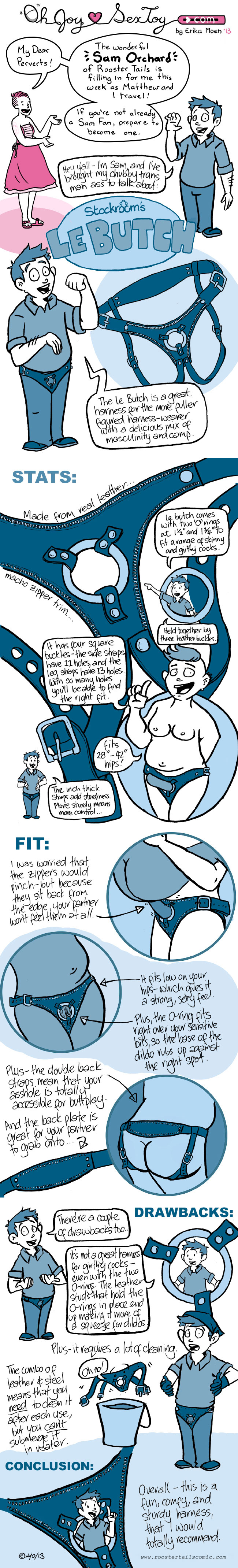 Matthew and I are off traveling for the next two weeks– which is lucky for you, because you get treated to some awesome guest comics from my favorite cartoonists! This week our great friend Sam Orchard writes about his harness the Le Butch. I’ve been a fan of Sam for years now, his voice is a joy to read in the world of queer identity and comics. I especially recommend his Queer 101 comic, it’s a must-read.
