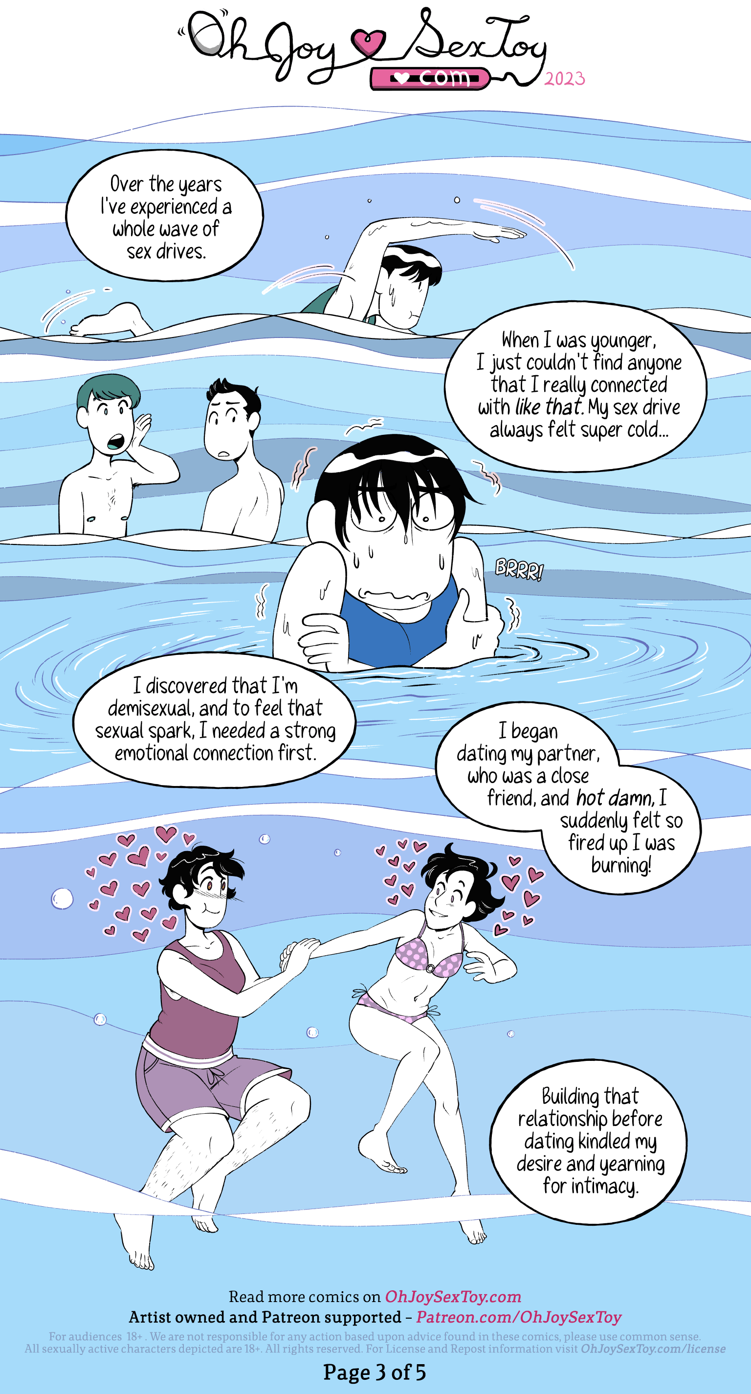 NARRATION: Over the years I've experienced a whole wave of sex drives. When I was younger, I just couldn't find anyone that I really connected with like that. My sex drive always felt super cold... I discovered that I'm demisexual, and to feel that sexual spark, I needed a strong emotional connection first. I began dating my parter, who was a close friend, and hot damn, I suddenly felt so fired up I was burning! Building that relationship before dating kindled my desire and yearning for intimacy.