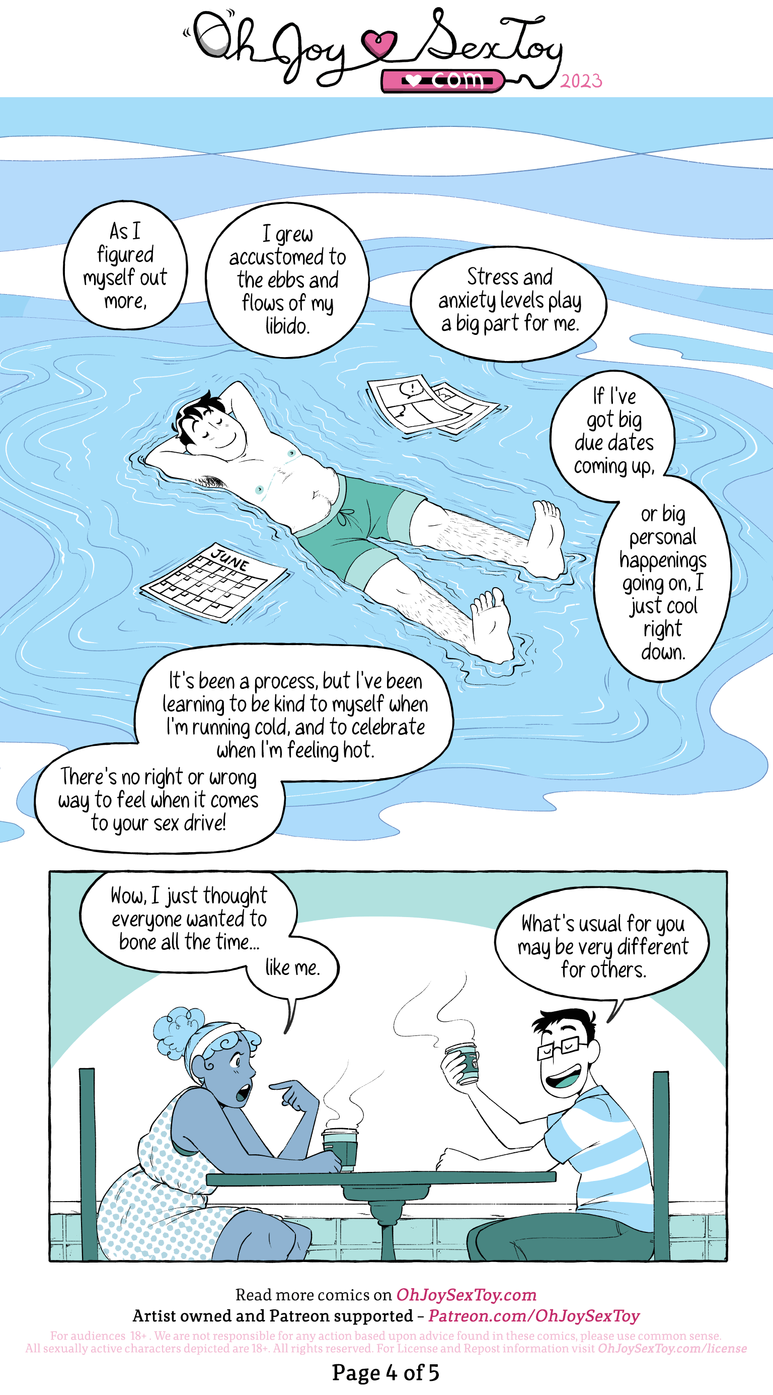 NARRATION: As I figured myself out more, I grew accustomed to the ebbs and flows of my libido. Stress and anxiety levels play a big part for me. If I've got big due dates coming up, or big personal happenings going on, I just cool right down. It's been a process, but I've been learning to be kind to myself when I'm running cold, and to celebrate when I'm feeling hot. There's no right or wrong way to feel when it comes to your sex drive!