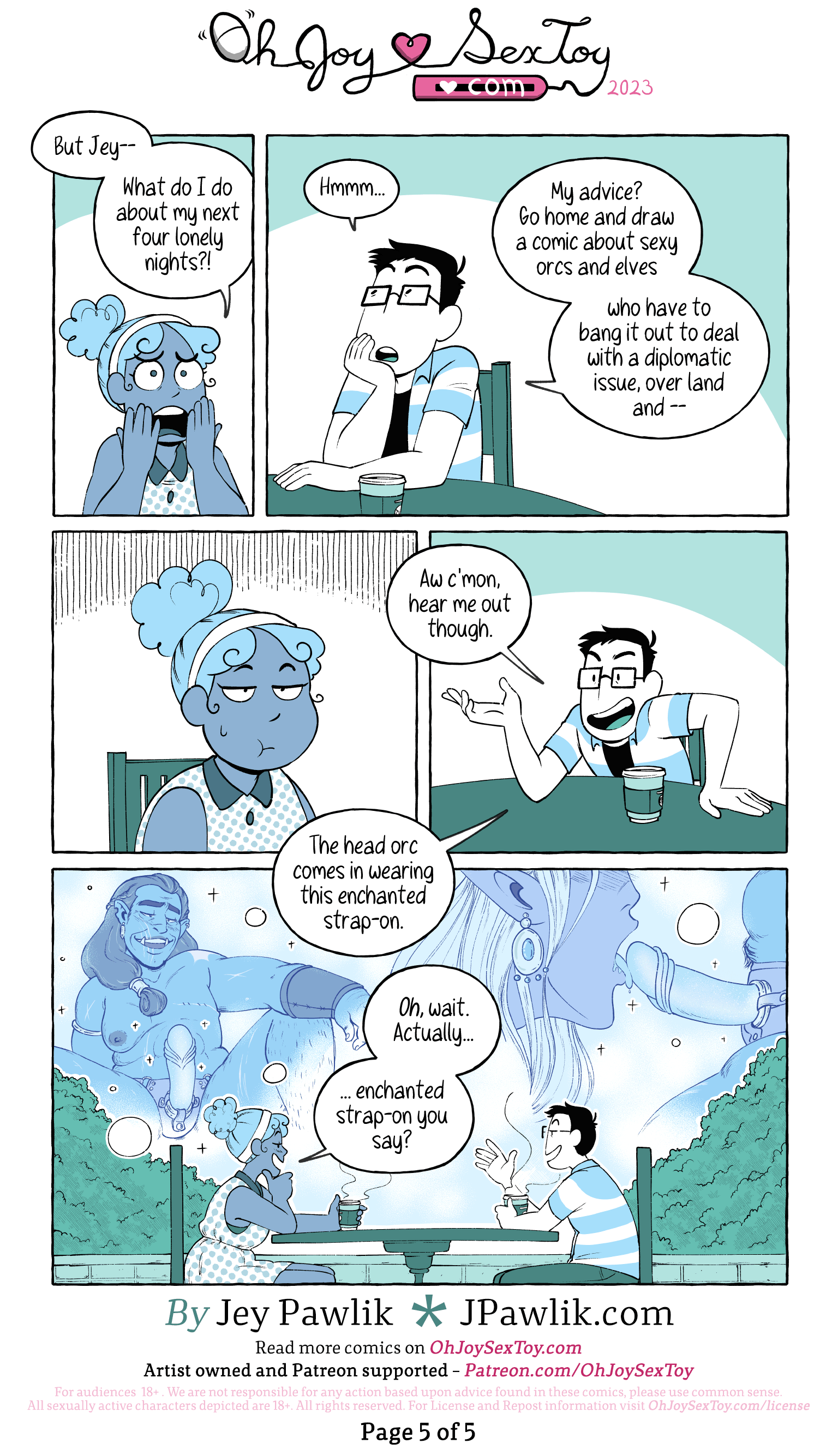 "Hmm..." Jey ponders. "My advice? Go home and draw a comic about sexy orcs and elves. Who have to bang it out to deal with a diplomatic issue, over land and--"