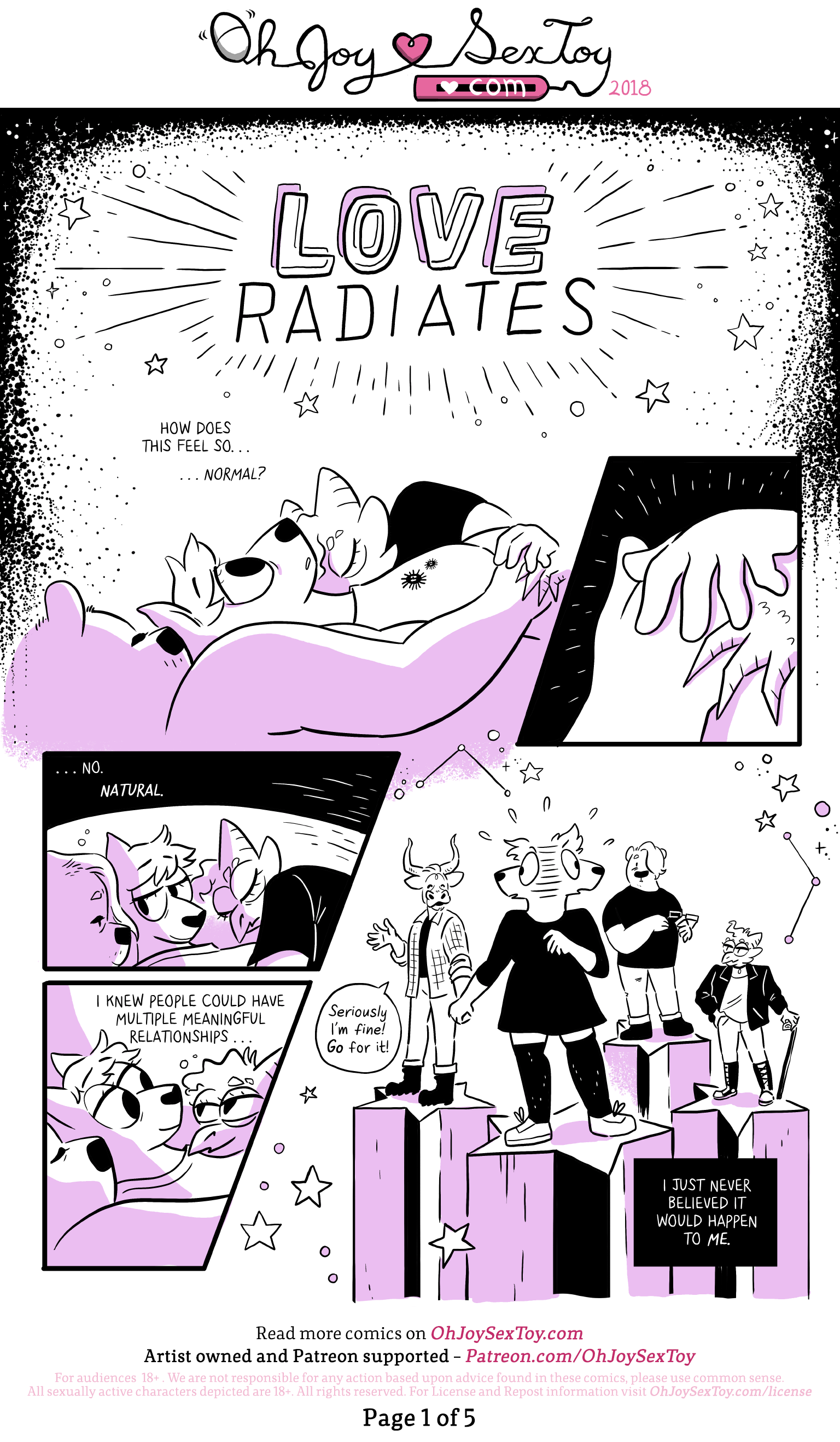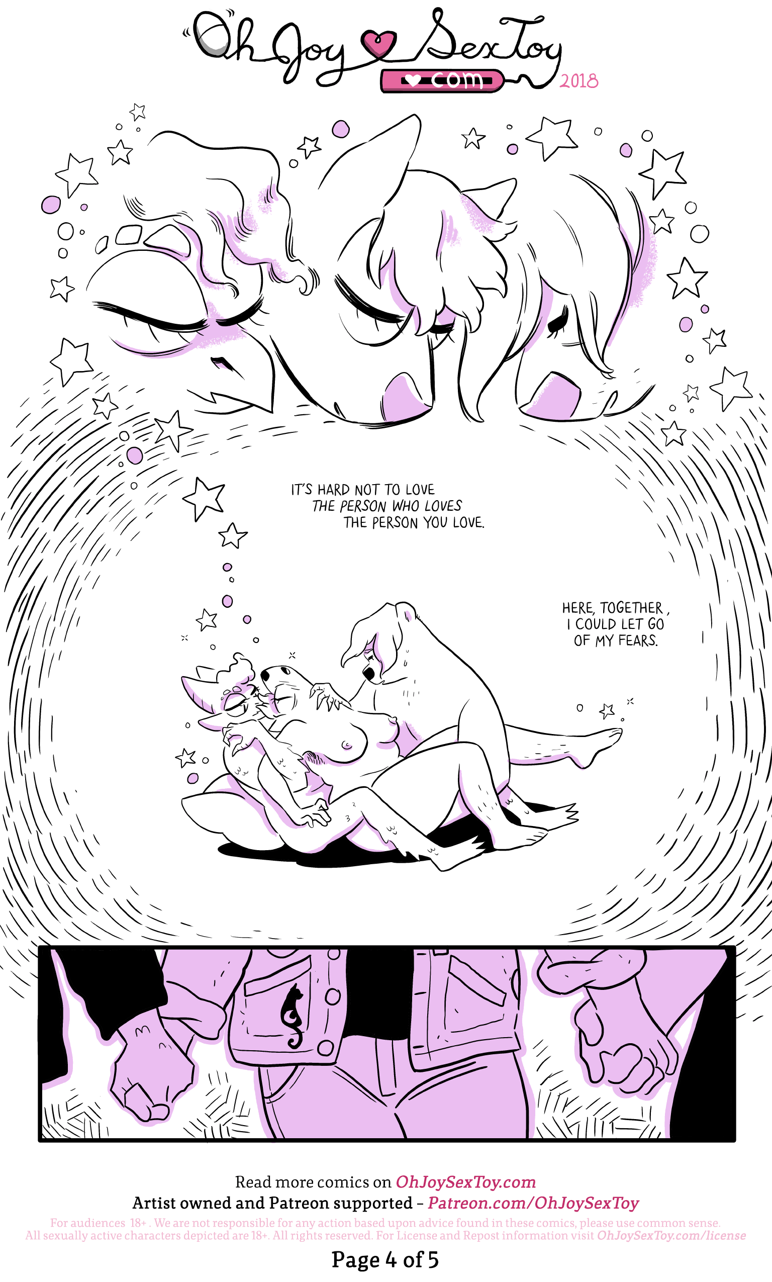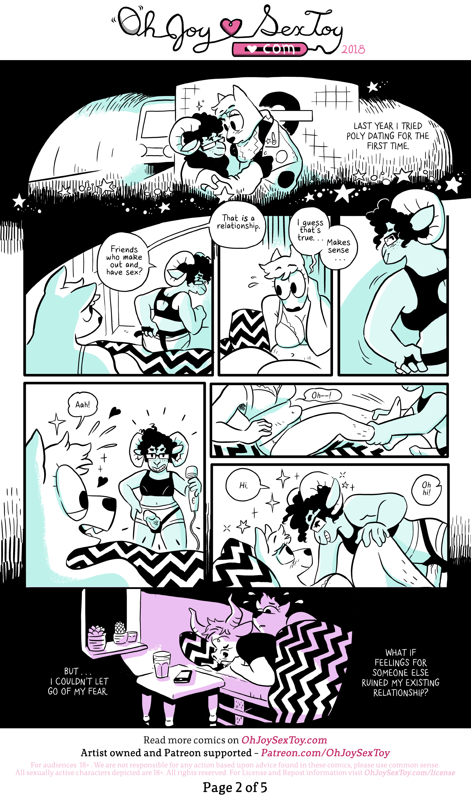 Jem watches as the ram, who has their back to Jem, tightens up a strap-on harness while saying "Friends who make out and have sex? That IS a relationship." Jem blushes, sitting on the bed in a bra and underwear, and replies sheepishly "I guess that's true... Makes sense..." The ram looks at Jem mischievously and then turns around triumphantly showing off their strap-on dildo and holding a giant vibrator wand. Jem gasps in joy and lust. The ram tugs Jem's feet to lay them on their back and mounts them flirtatiously saying "Hi." "Oh hi!" replies Jem with expectant, flirty eyes.