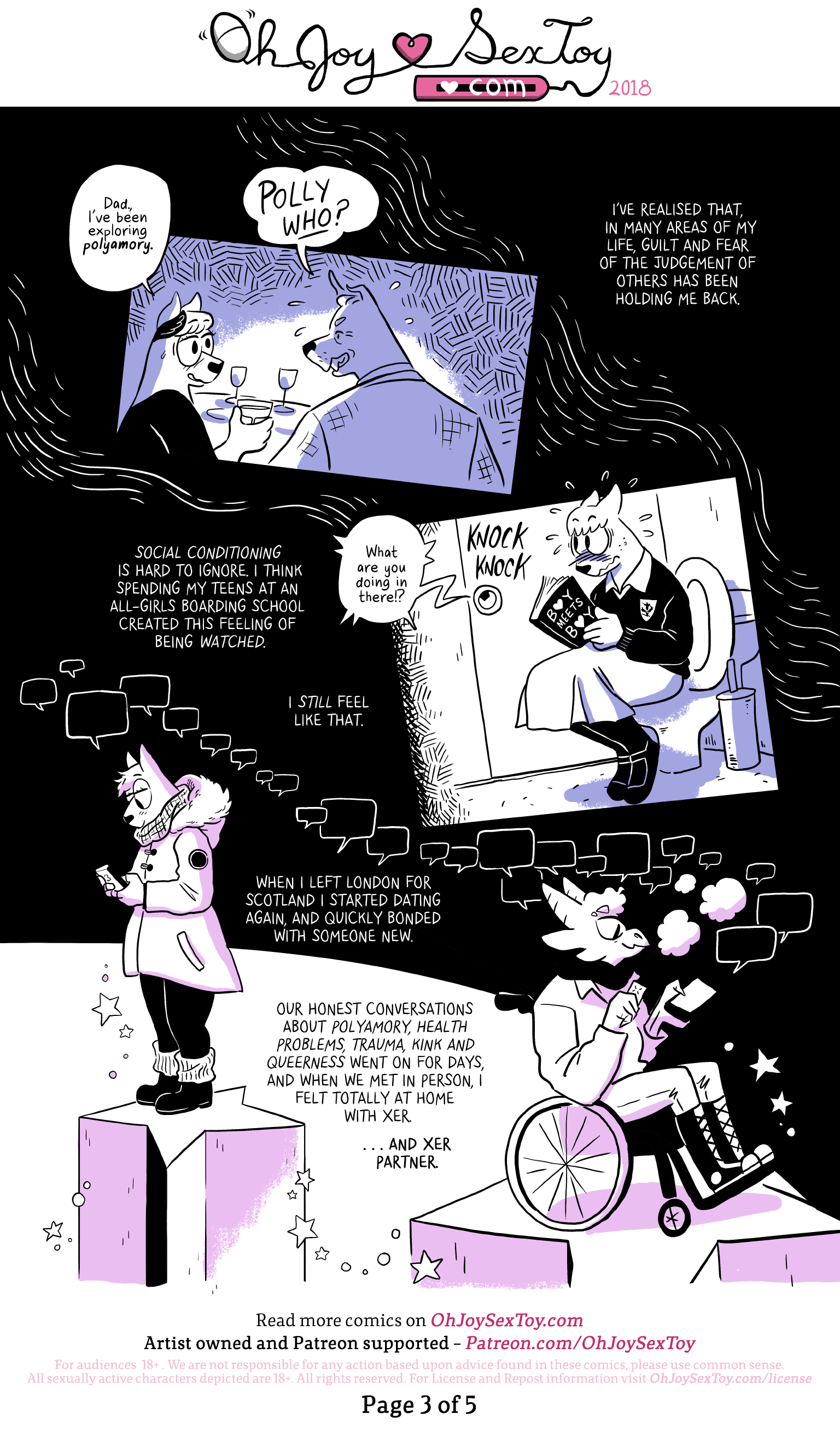 Narration: When I left London for Scotland I started dating again, and quickly bonded with someone new. Our honest conversations about polyamory, health problems, trauma, kink and queerness went on for days, and when we met in person, I felt totally at home with xer. ...and xer partner.