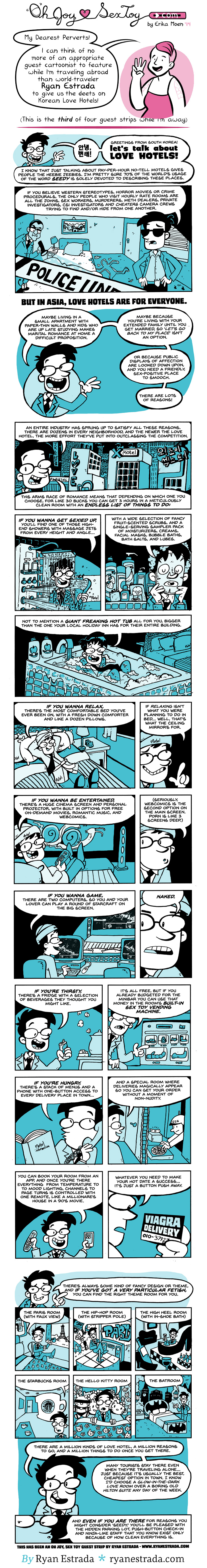 Thank you so much to world-traveler and hella prolific cartoonist Ryan Estrada for his write-up on Love Hotels! Oh my lord, the giant high heel hot tub kills me.