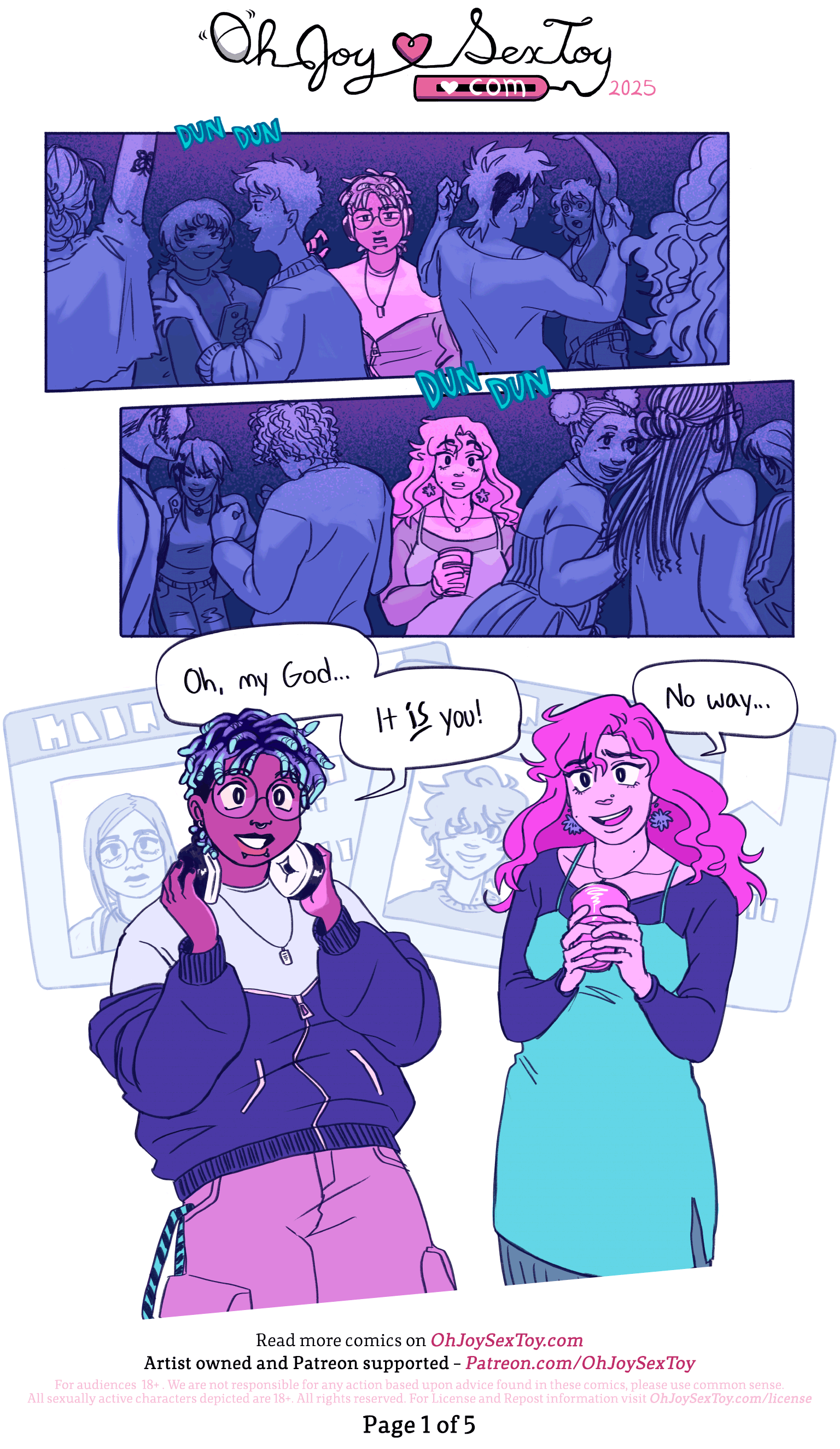 "Oh, my God..." Jude marvels to Lizzie while pulling off his headphones. "It IS you!" The two are now standing next to each other, the dark, dancing crowd replaced with a bright white background and their former high school IDs blown up huge behind them. Jude's shows a younger version of themself with shoulder-length straight hair and no piercings, while Lizzie's shows her younger self with a mop of fluffy curly hair partially obscuring her eyes and wearing a masculine top with a thick collar.